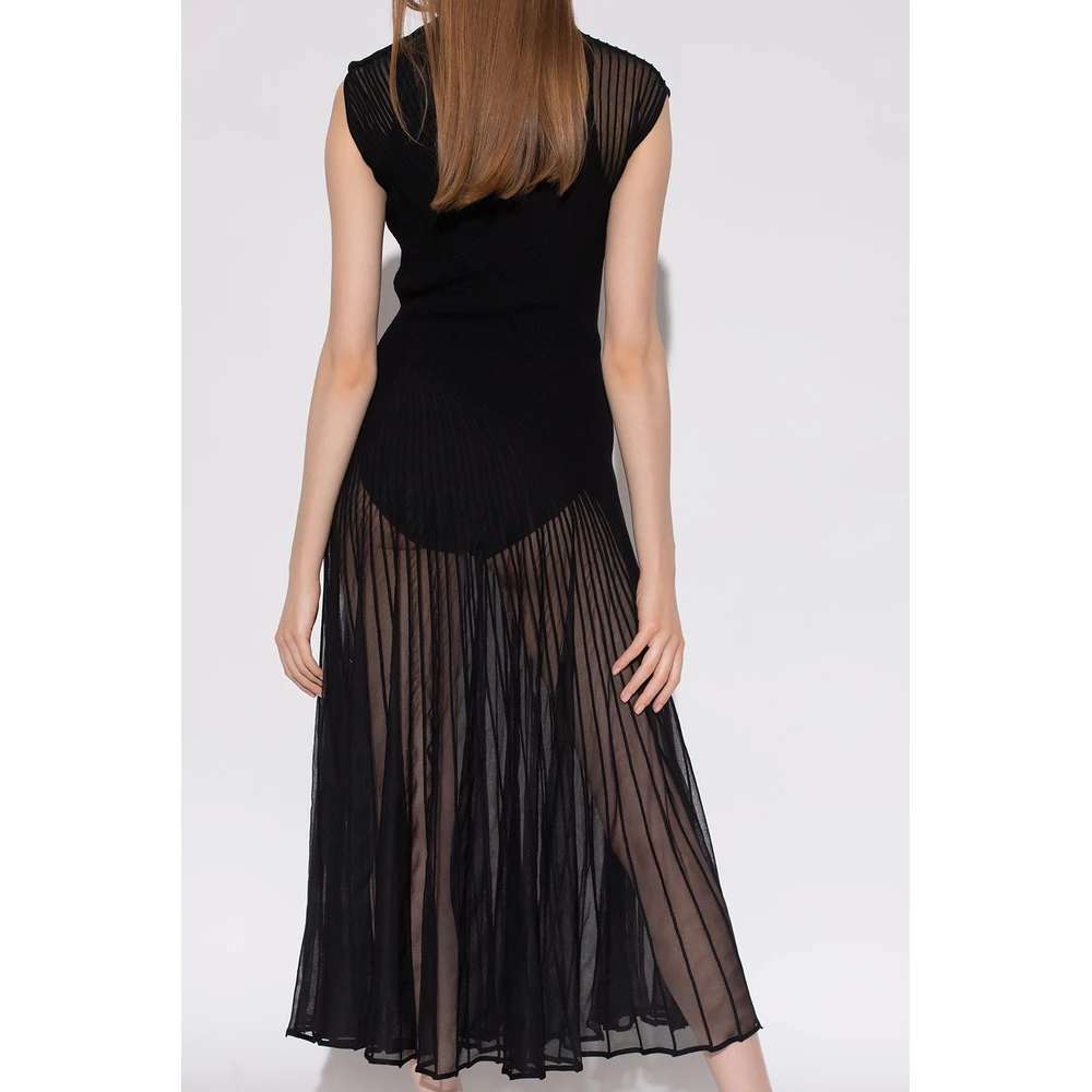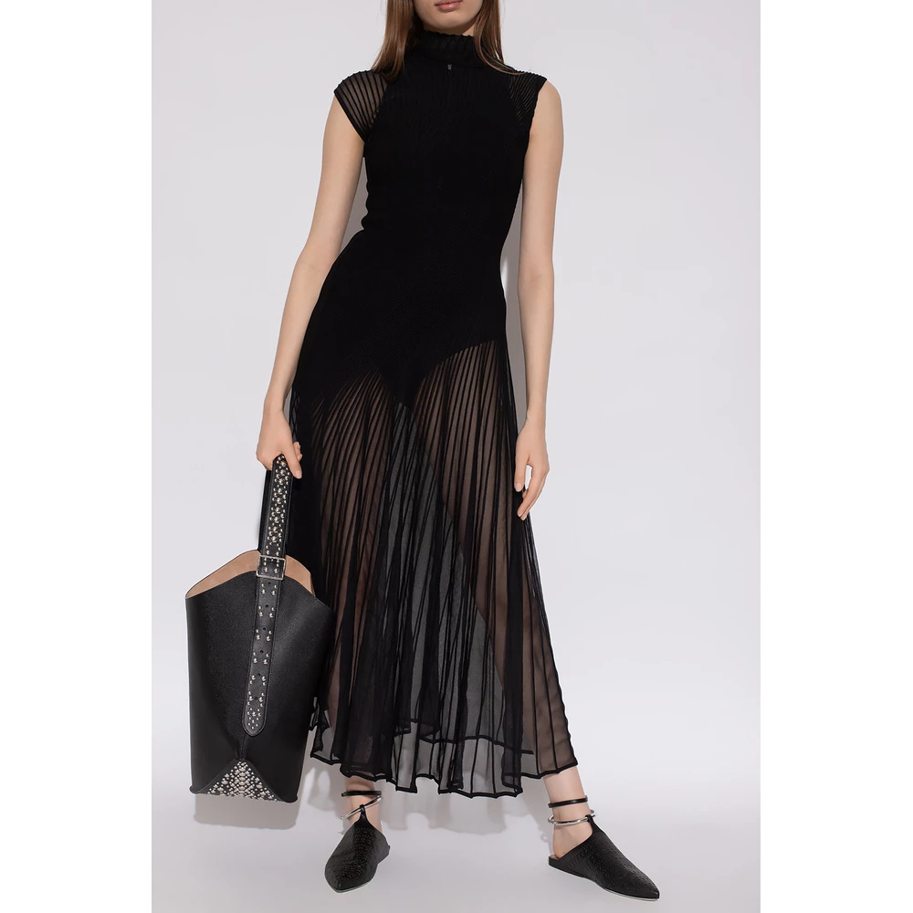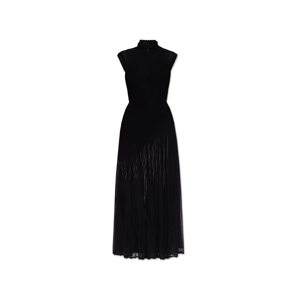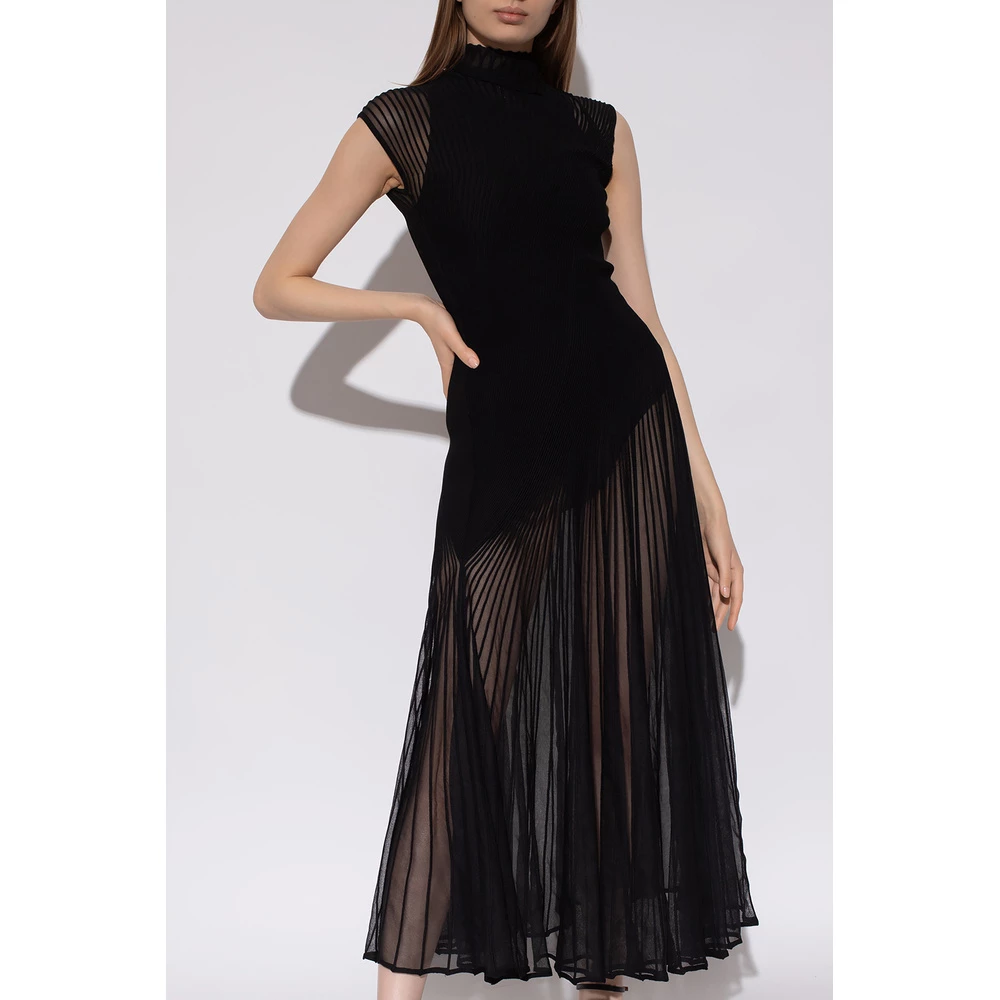 Svart ermeløs kjole fra Alaia. Denne designen er laget av en halvtransparent ribbet silkeblanding, og har knapper på skuldrene, skjult glidelås og stand-up krage.
