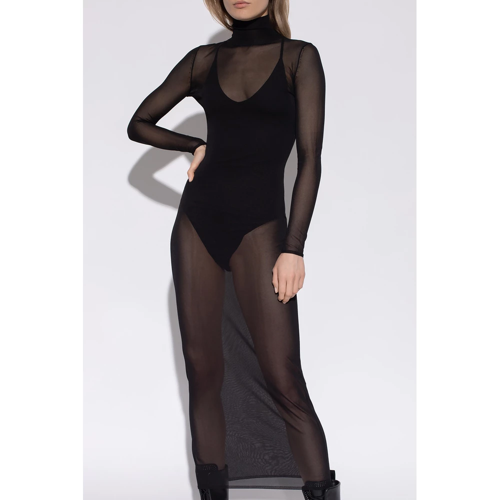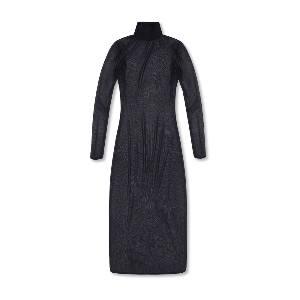 Svart Maxi -kjole fra Alaia. Denne stilen er laget med en semi-sheer-finish, og har lange ermer og elastiske kanter.