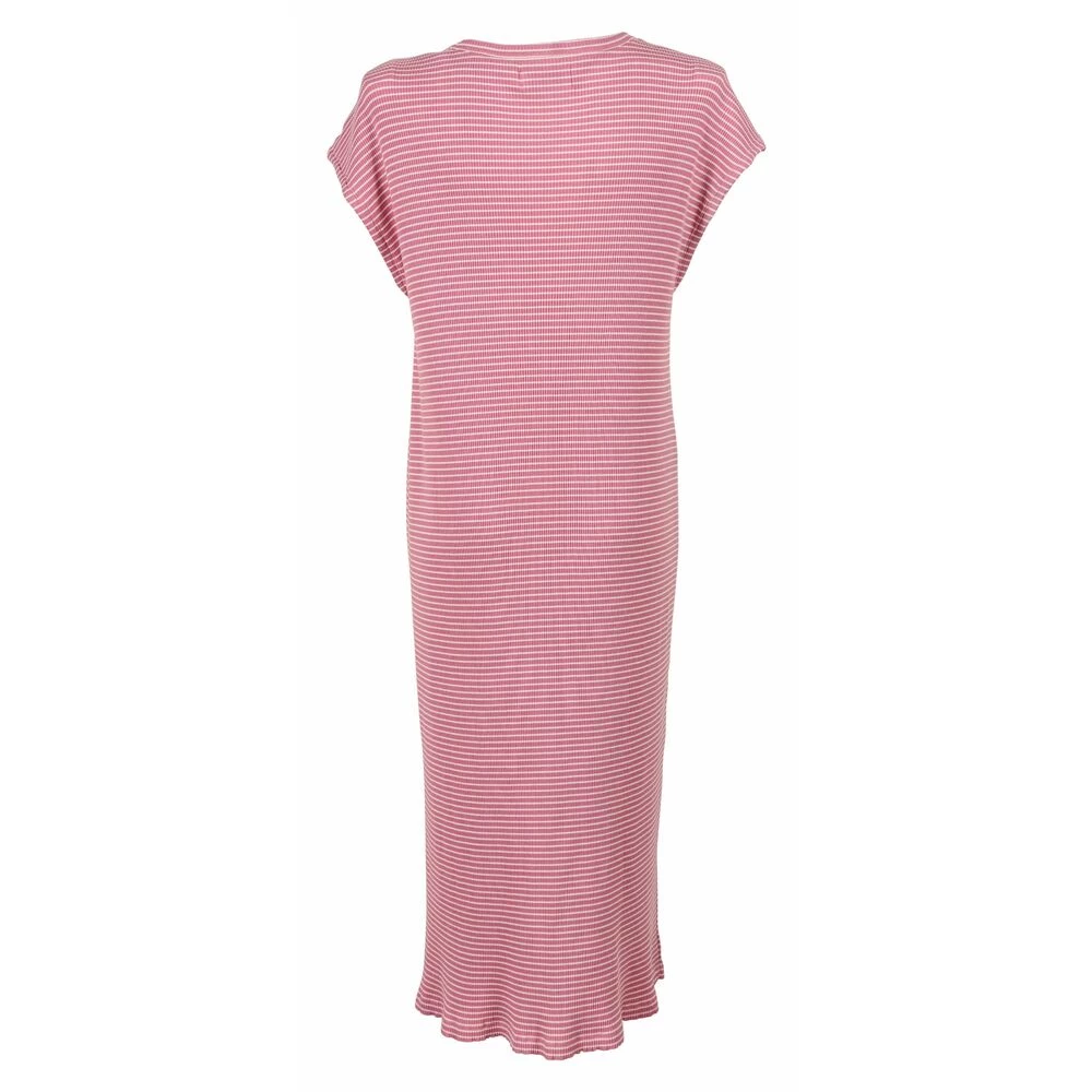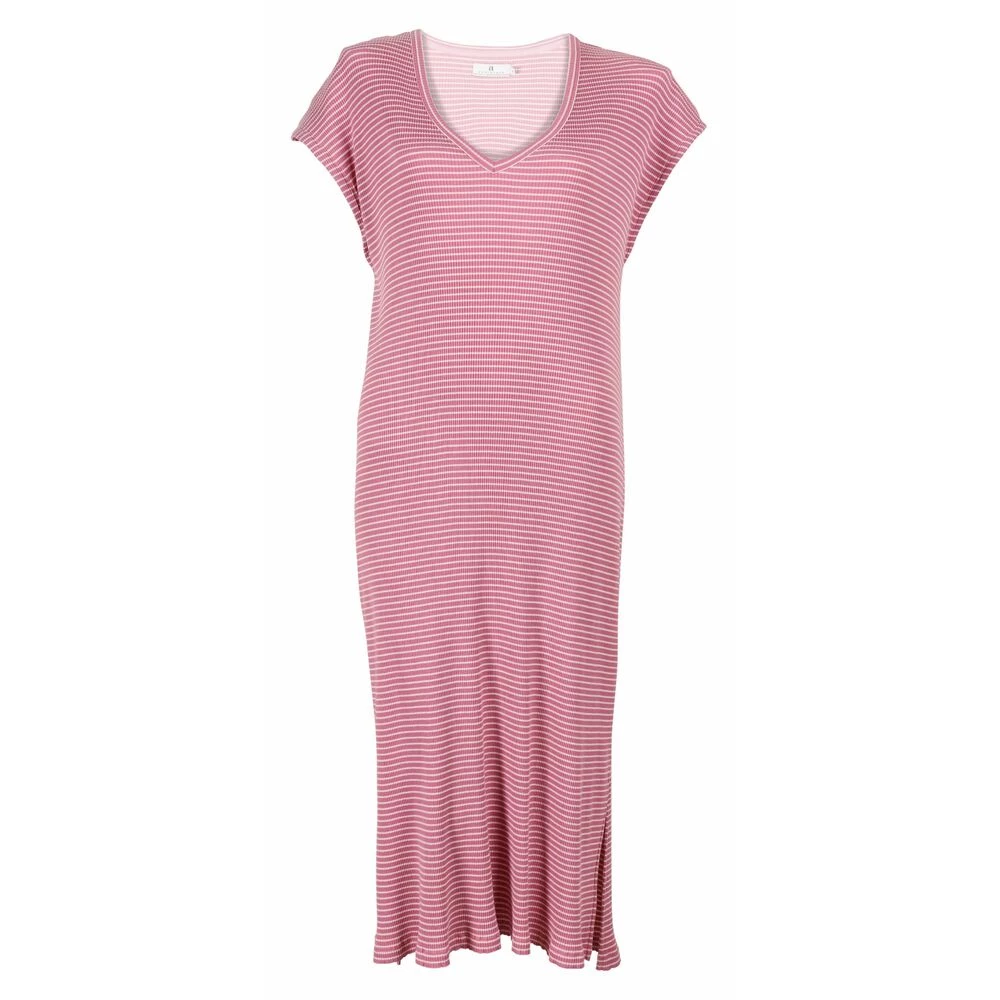 Arnie Says – Liza Stripe Komfortabel kjole i stretchy bomullskvalitet. Modellen er rett i fasongen, med v-utringning, splitter på sidene og et hakket lengre bakstykke. Kuttet med nette t-skjorte ermer. Denne stylen er et godt valg på varmere dager.