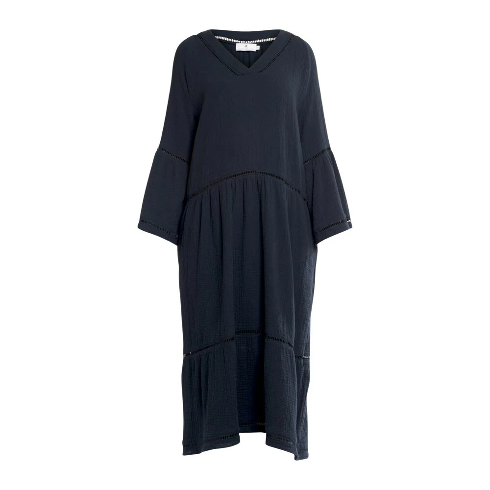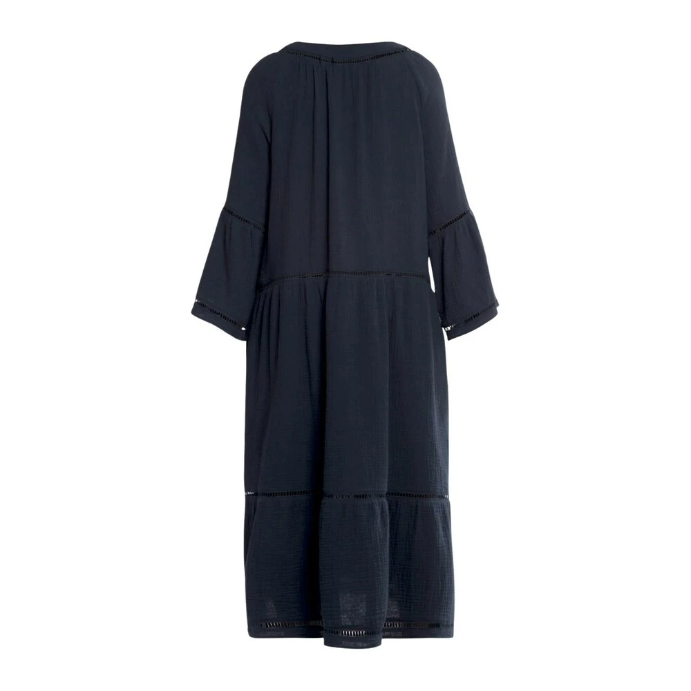 Ludivine Gauze fra Arnie Says. Fjorårets bestselger er tilbake og nå i en kledelig mørk blå farge! En lang ledig kjole i a fasong laget i fint bomullsstoff. Kjolen har en behagelig og romslig passform med V-hals og vide ermer. Praktiske lommer på sidene. Kjolen har trompetermer og v-halsutringning og lekre detaljer ved hals, ermer og midje. En lett og delikat sommerkjole i kreppet bomull. Nedre del i skjørtet er foret. Litt stor i størrelsen. Materiale: 100% Bomull