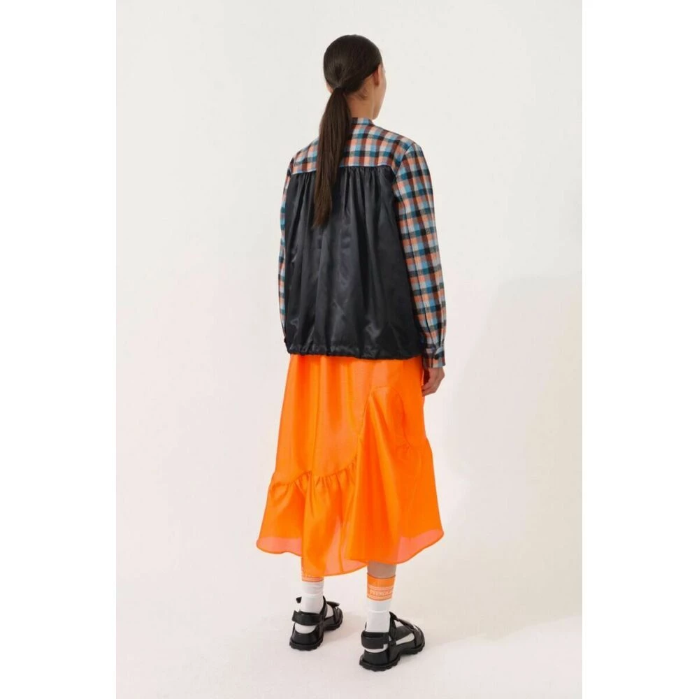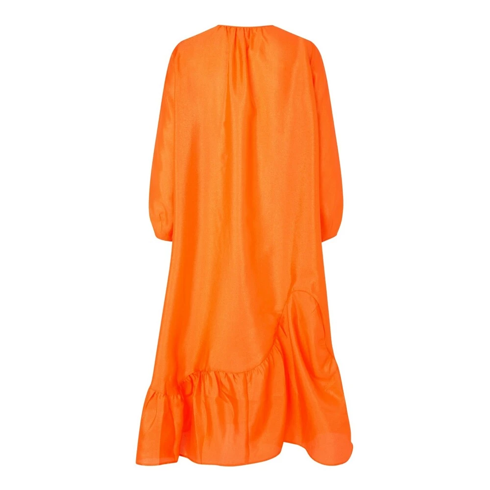 Halvgjennomsiktig midi-kjole med glidelås på brystet og trekvartlange ermer. Asymmetrisk fald med plissert panel nederst. Overdimensjonert snitt.