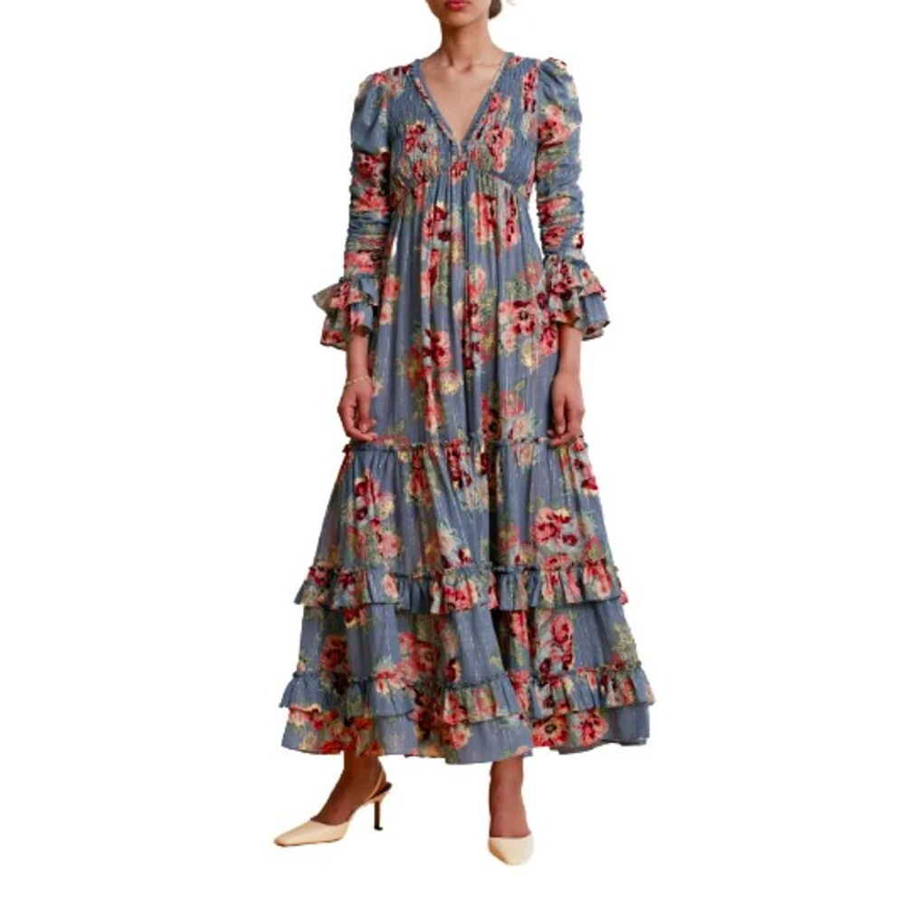 Bohemian Gown fra ByTimo. En nydelig maxikjole ii vakker blå farge med print. Den har dyp v-utringning og 3/4 lange ermer med volang og strikk nederst. Kjolen sitter over brystet med smock strikk og har ellers en løs passform. Normal i størrelsen. Materiale: 68% FSC certified viscose, 29% GOTS certified cotton, 3% lurex