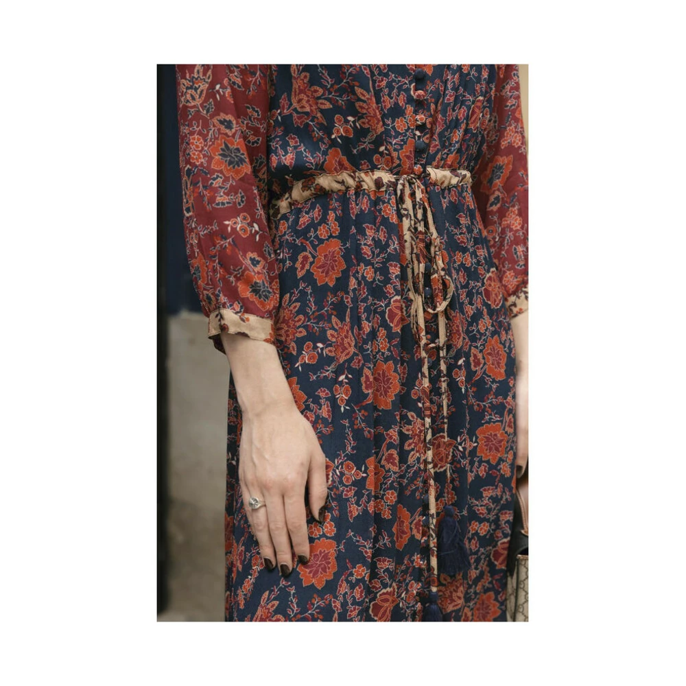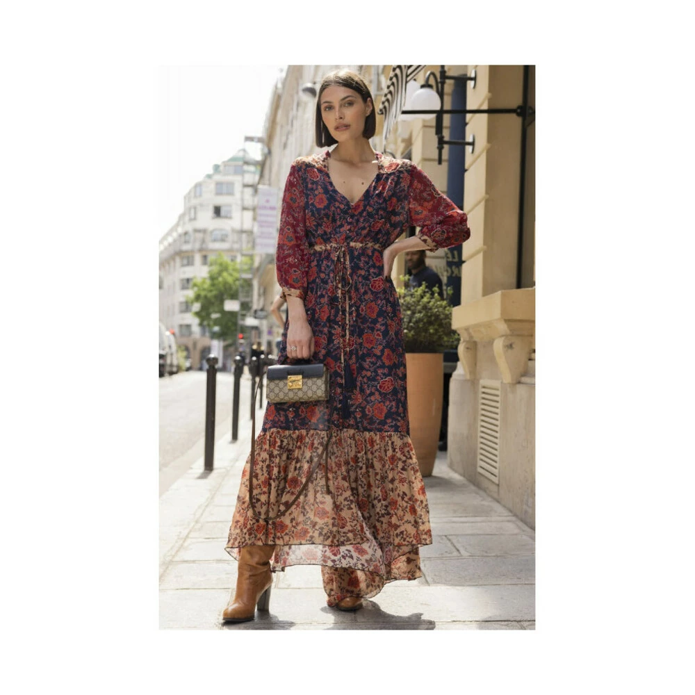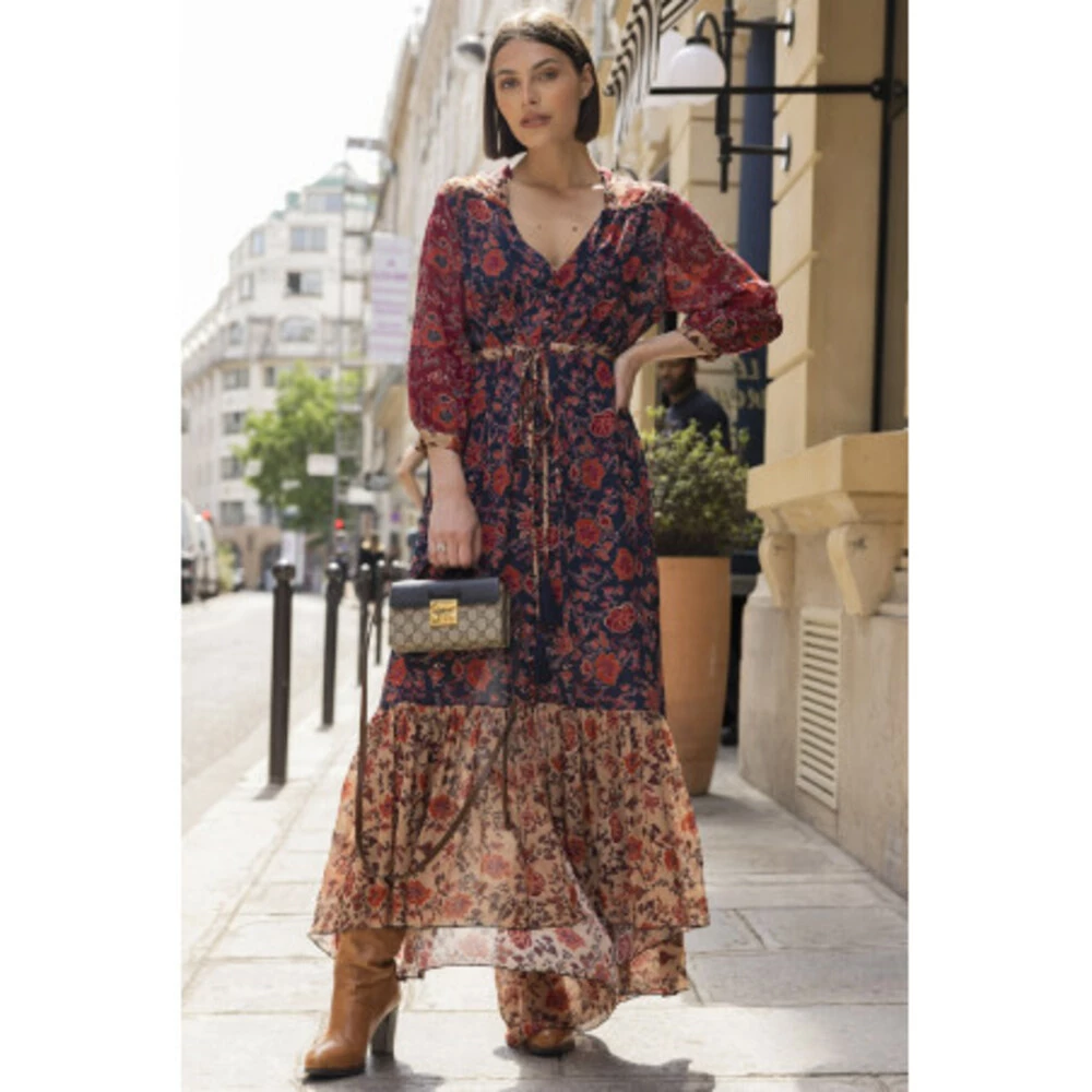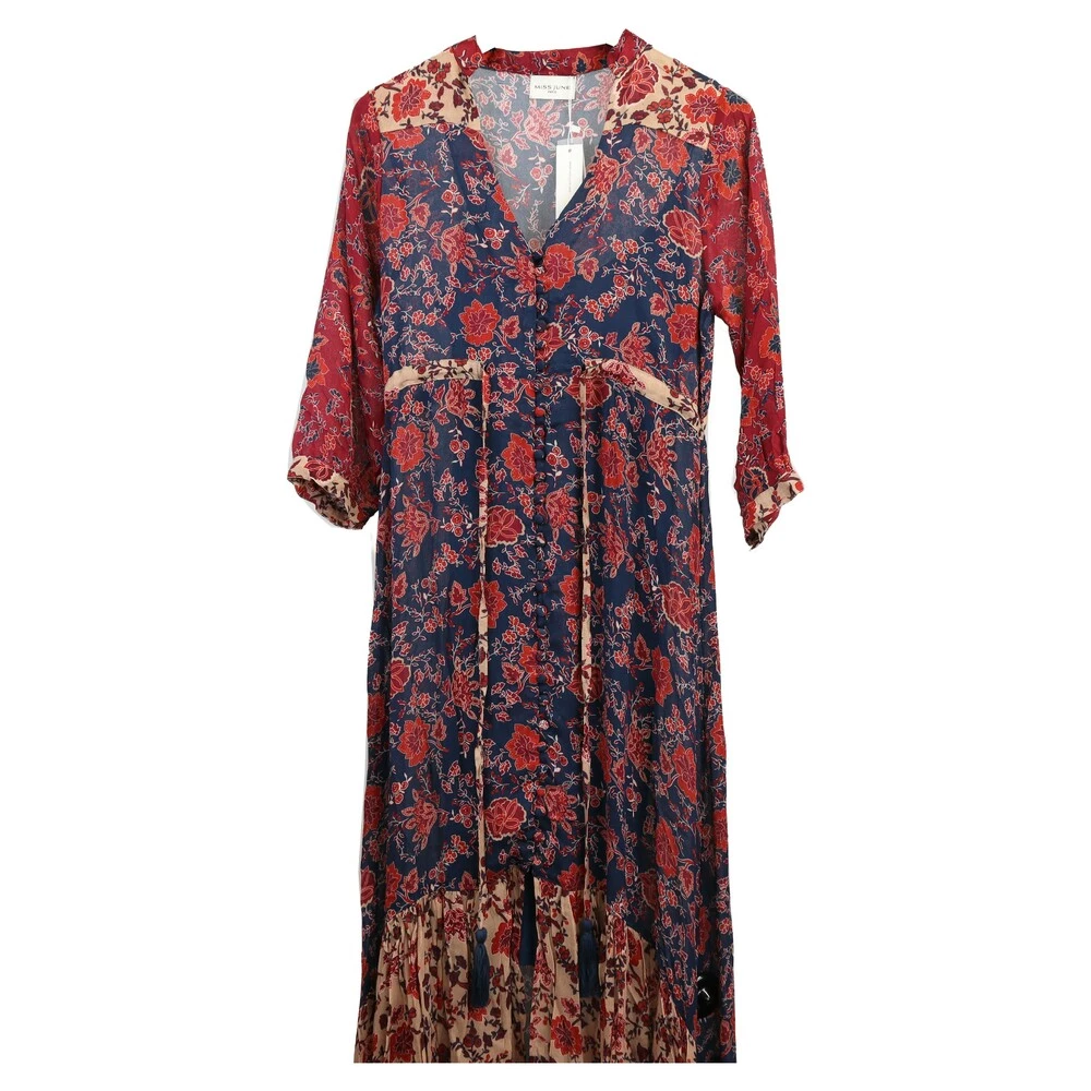 Dress Alice fra Miss June har V-hals og 3/4 dels lange ermer. Flott print av rødtoner, blått og beige i delikat kombinasjon. Crepe Rayon