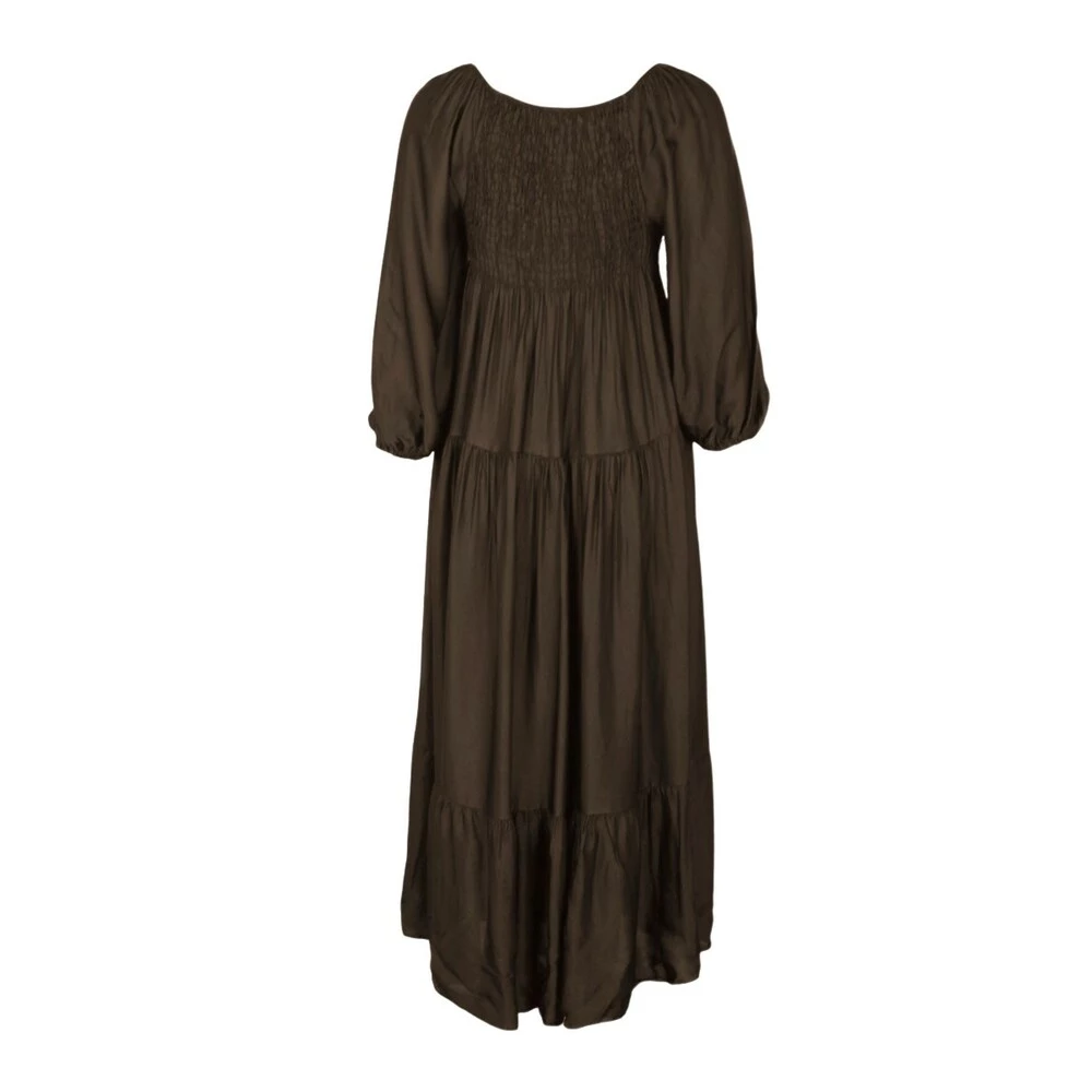 Fantastisk kjole i silke kvalitet. Bred vaffel søm over byste med god stretch. Lange ermer med strikk. 70% Viskose og 30% Silke. Finvask 30 grader med milo eller andre vaskemiddler tilberegnet silke. One size 36-42. 135 cm lang. Modellene er 175cm høye og bruker vanligvis M/L.