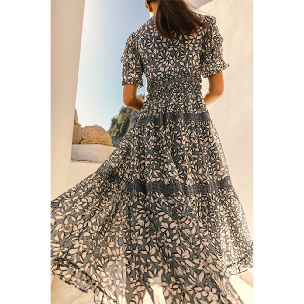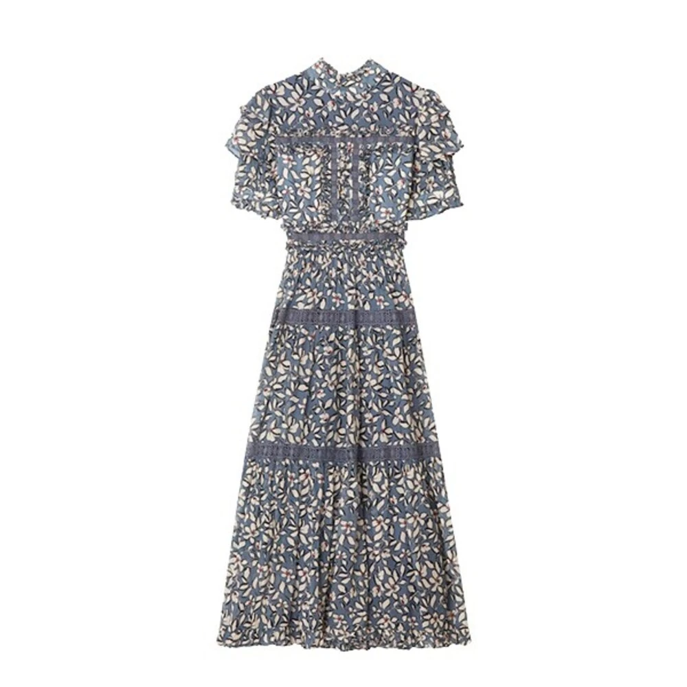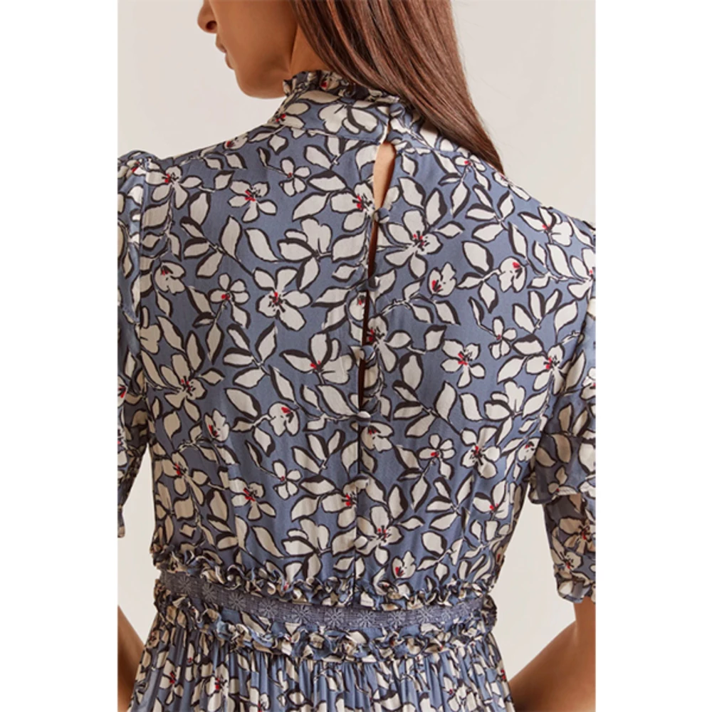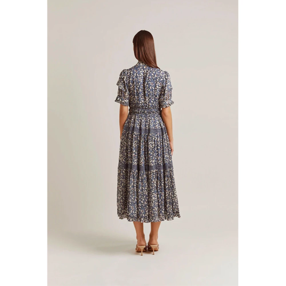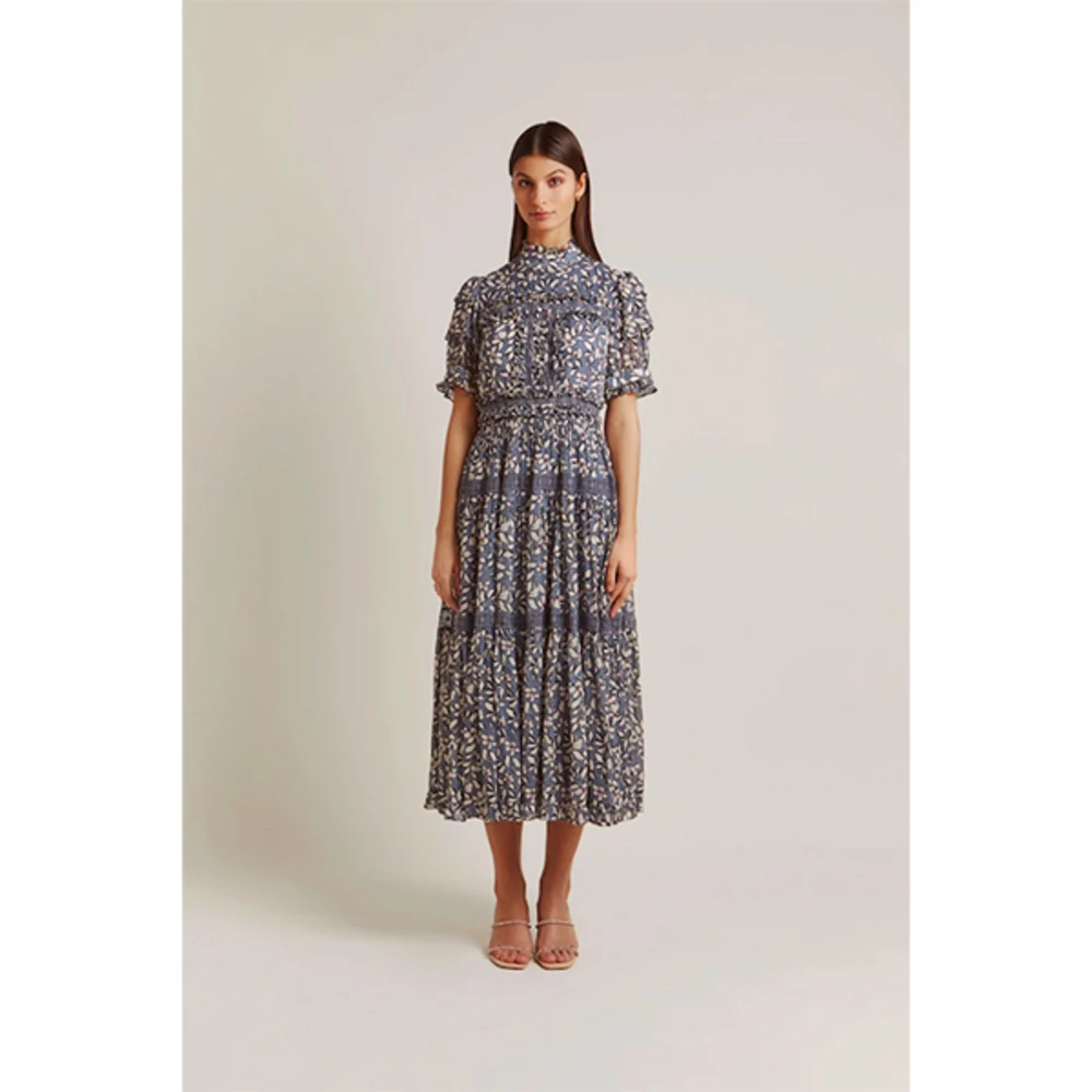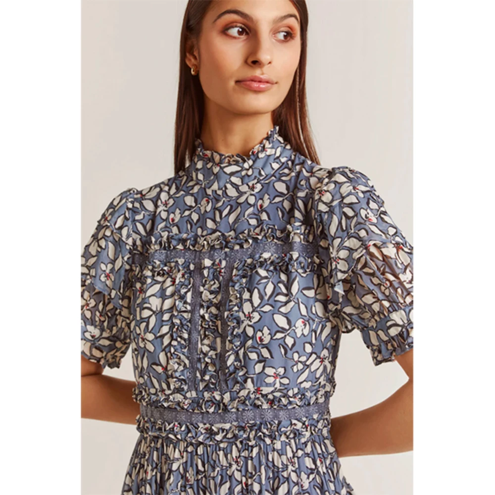 Nydelig mønstrete maxikjole fra By Malina. Kjolen markerer midjen, har høy krage og korte ermer med flere lag som skaper litt volum i ermene. En kjole som passer til alle årstidene. Knapper på baksiden og glidelås i sidesømmen. Kjolen har volanger i både ermer og nedkant. Her kan man kombinere kjolen med et par høye heler, en veske og en kort eller lang jakke for kalde kvelder. Perfekt kjole til bryllup og fest. Normal i størrelsen. Velg din vanlige størrelse. Detaljer: Modell: Iro Maxi Dress Farge: Fiore Materiale: 100% Viskose Vask: Kun rens