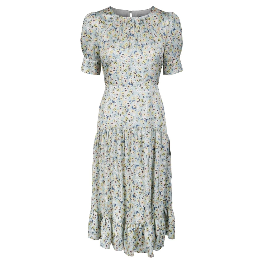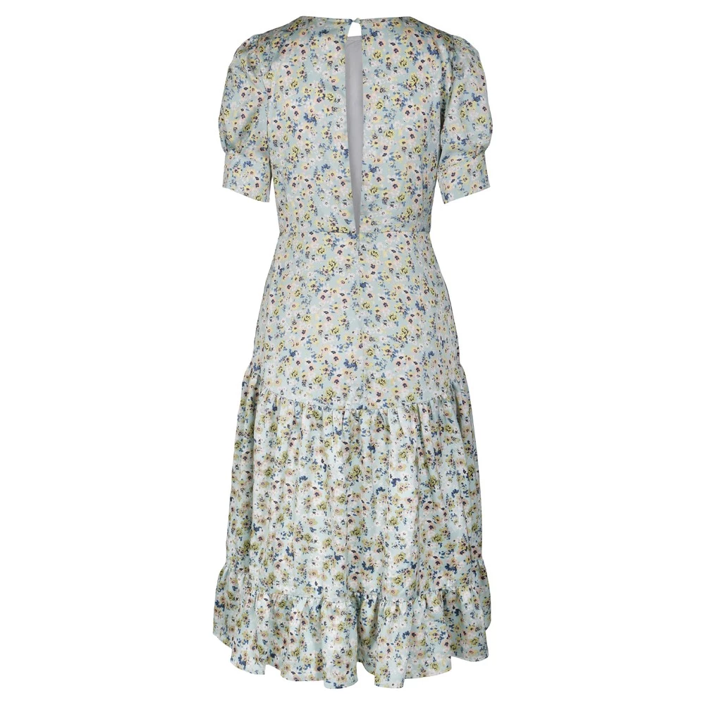 Kjolen har et romantisk trykk og sitter skånsomt på kroppen. Korte brune ermer, rund hals og knelengde.