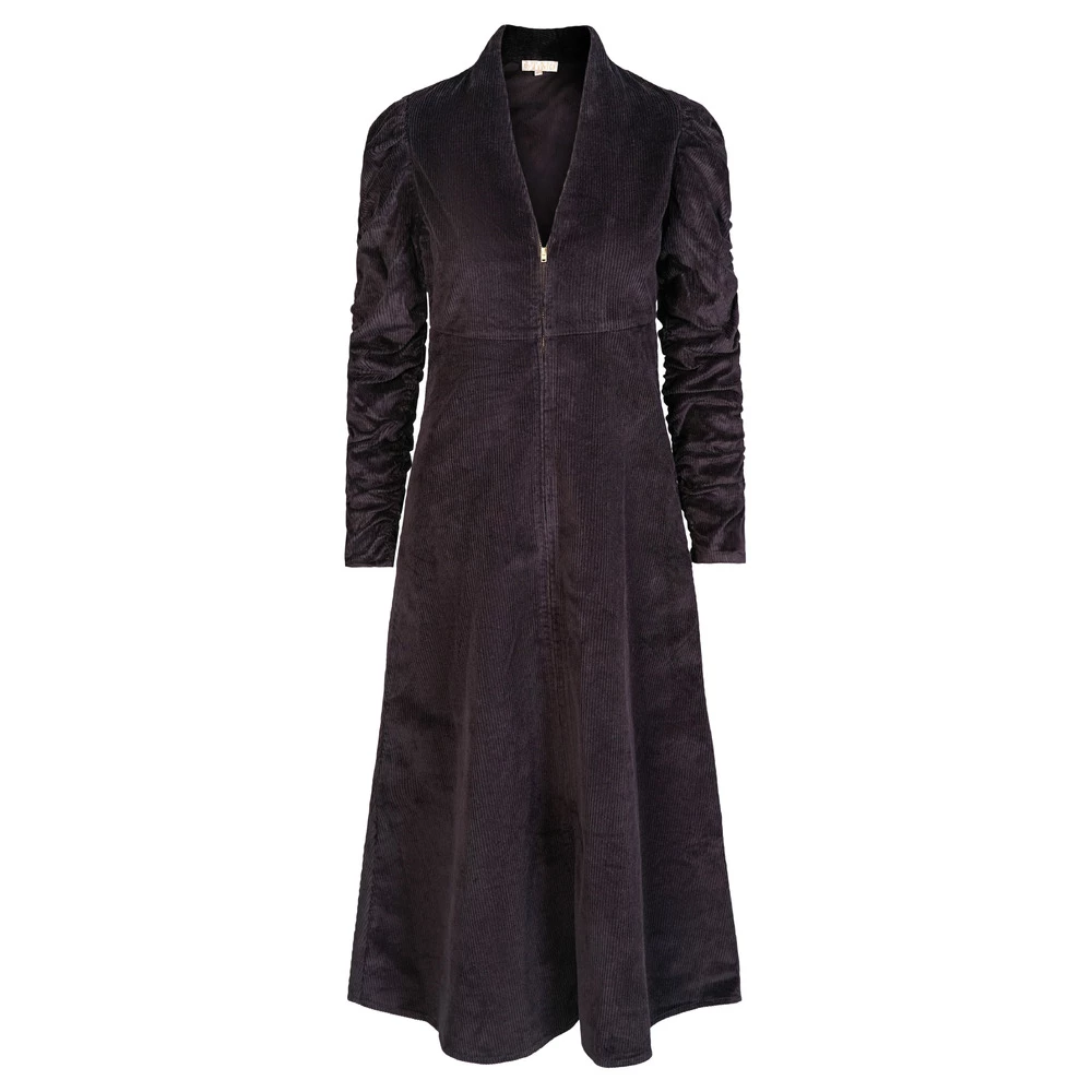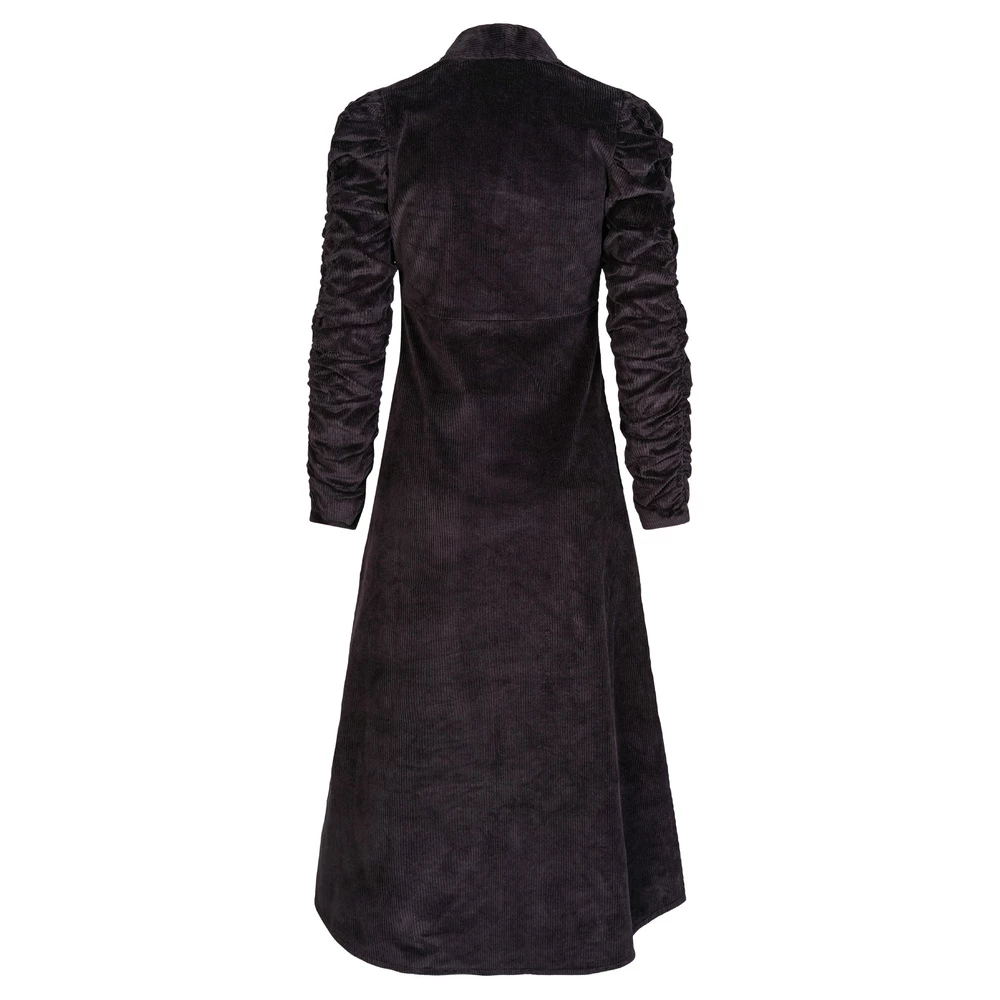 Corduroy V-hals kjole fra By Timo. Leaky Cord kjole i clic svart farge med V-hals, smale ermer med dekorativ rynkesøm og smal puff over skuldrene. Den lukkes med skjult glidelås foran. Midikjole med stor lengde til omtrent midt på benet og splitt foran.