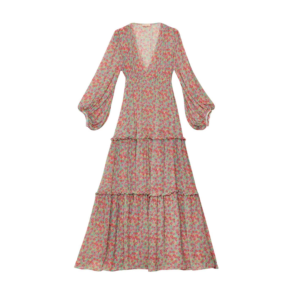 Delicate Gown Daydream er en nydelig maxi -kjole fra Timo. Kjolen har lange ermer, delikate blomstertrykk og V-hals.