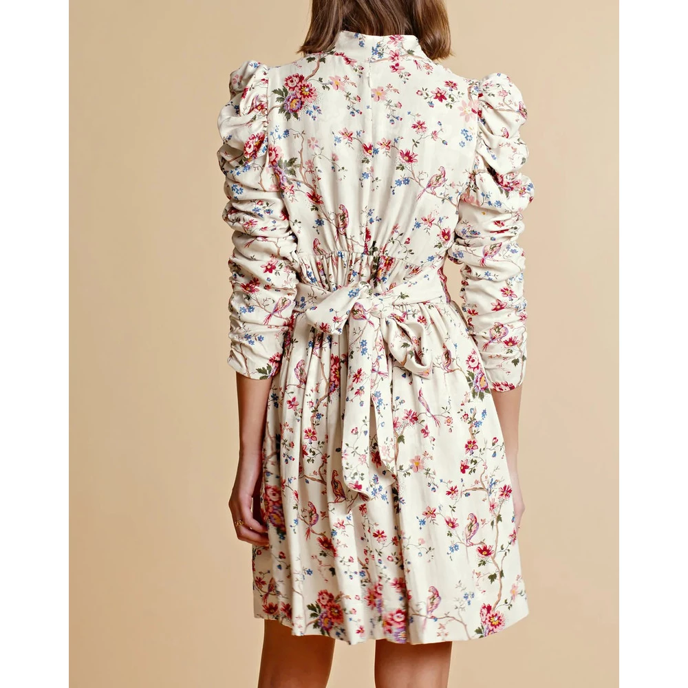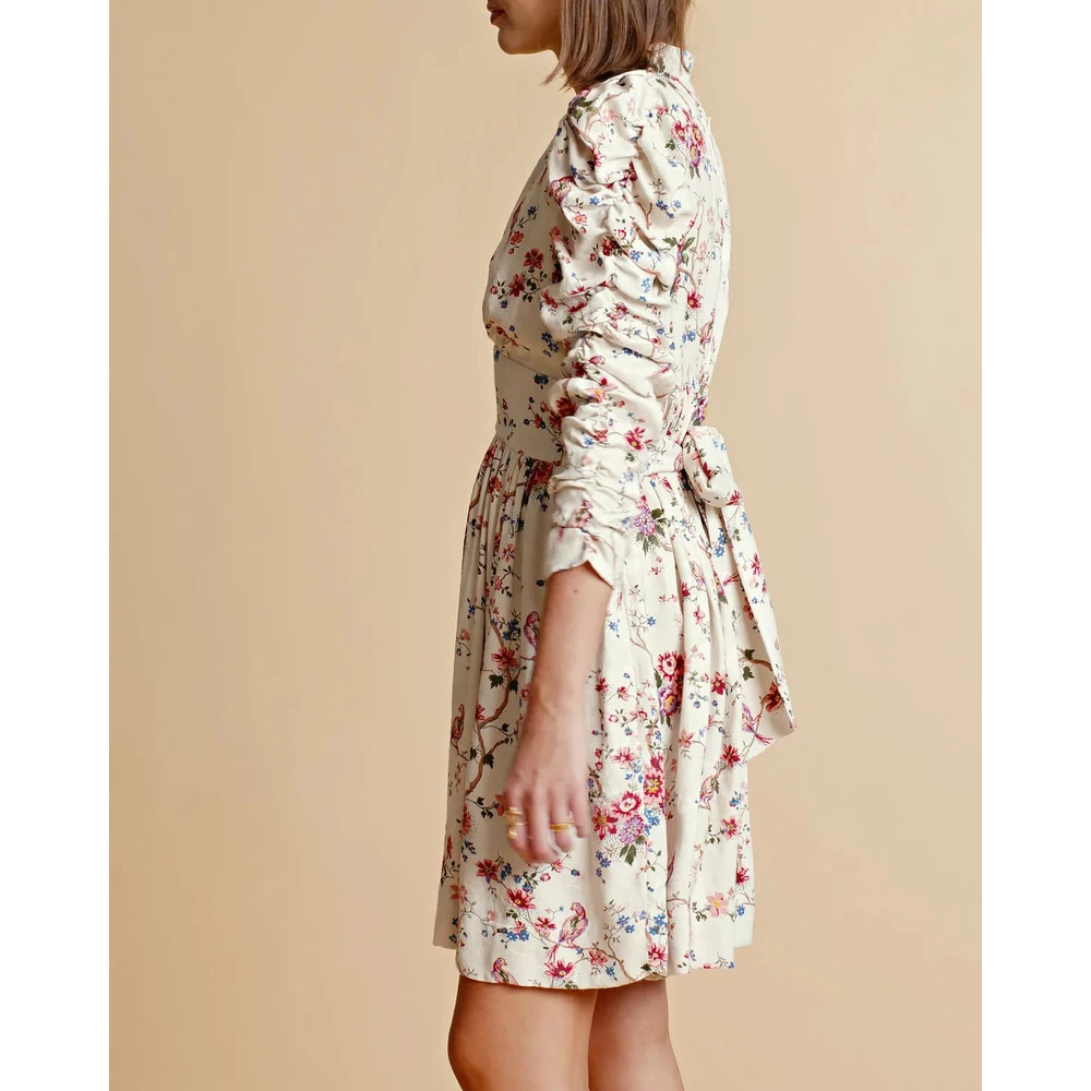 Jacquard Tieband-kjolen er laget i By Timo sin myke og delikate FSC-sertifiserte og 100 % bærekraftige viskose. Den har en minilengde, en tilpasset midje og lange ermer laget av rouching. Kjolen har dyp v-hals og knytebånd bak i midjen. Farge: Flower Garden