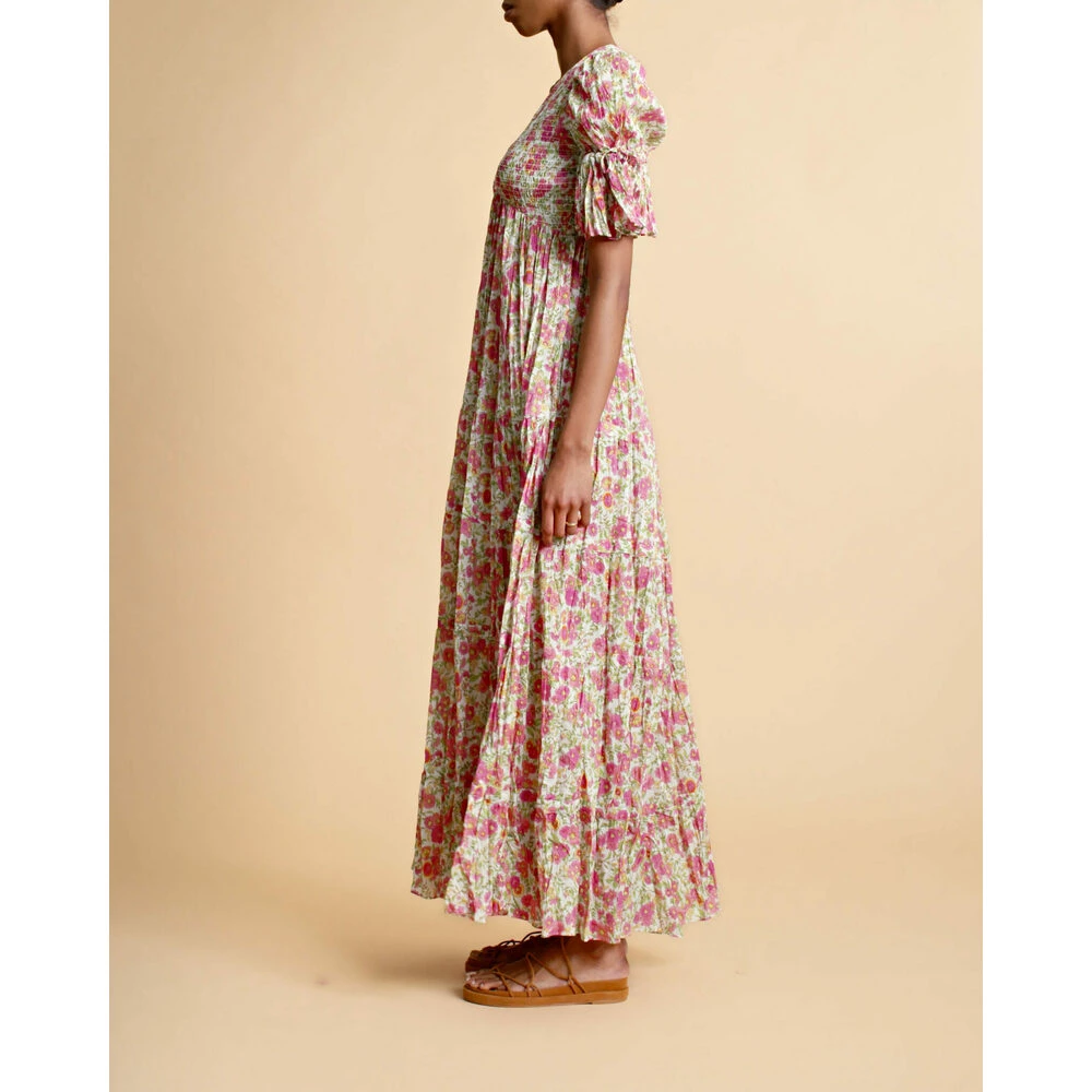 Lang kjole i sertifisert bomull. Den har et volumin�st skj�rt og korte, puffede ermer med sn�ring. Kjolen har ogs� v-hals og fine printdetaljer. Materiale: 100% bomull Produktstil-ID: 2230523 Denne beskrivelsen har blitt oversatt automatisk.