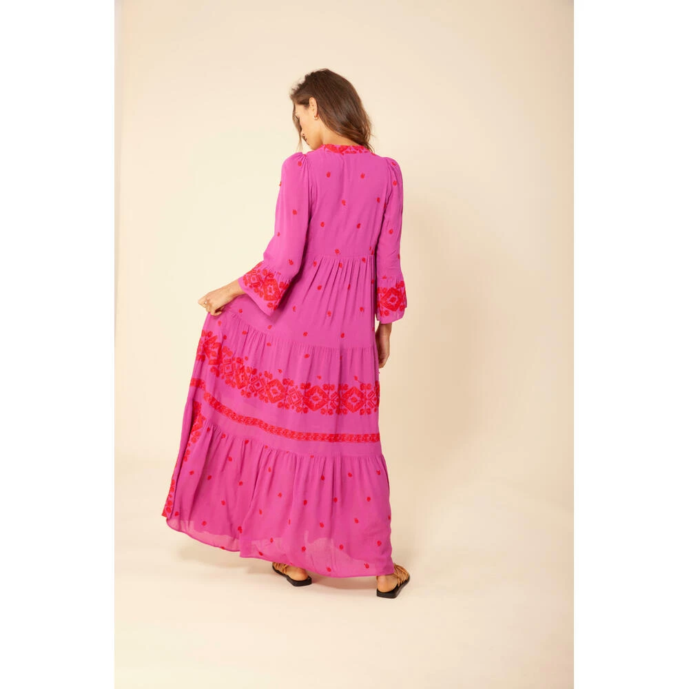 Nydelig maxikjole med broderi fra Hale Bob. V-hals og 3/4 lange ermer. Kvalitet: 100% rayon både i for og kjole. Vask: Dry clean