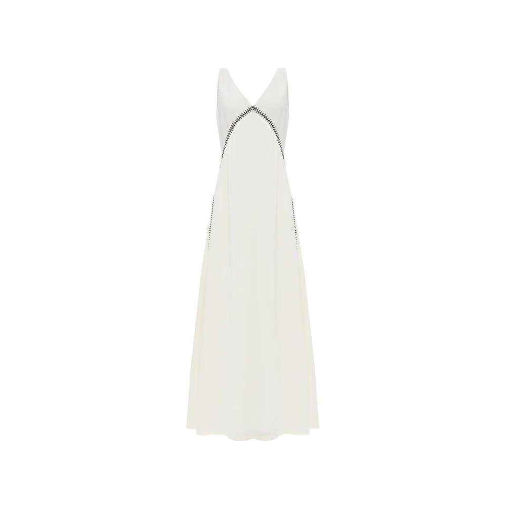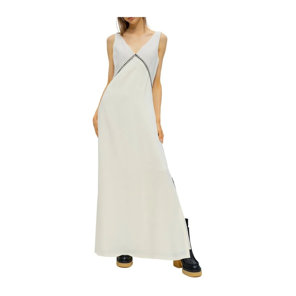 Krem maxi ermeløs kjole fra Chloe. Denne stilen er laget av ull, og har glidelås med en krok og øye-lukking, en Empire-midje med kontrasterende svart sømopplysning, en bak- og fremre V-hals og frynsede spalter på sidene.