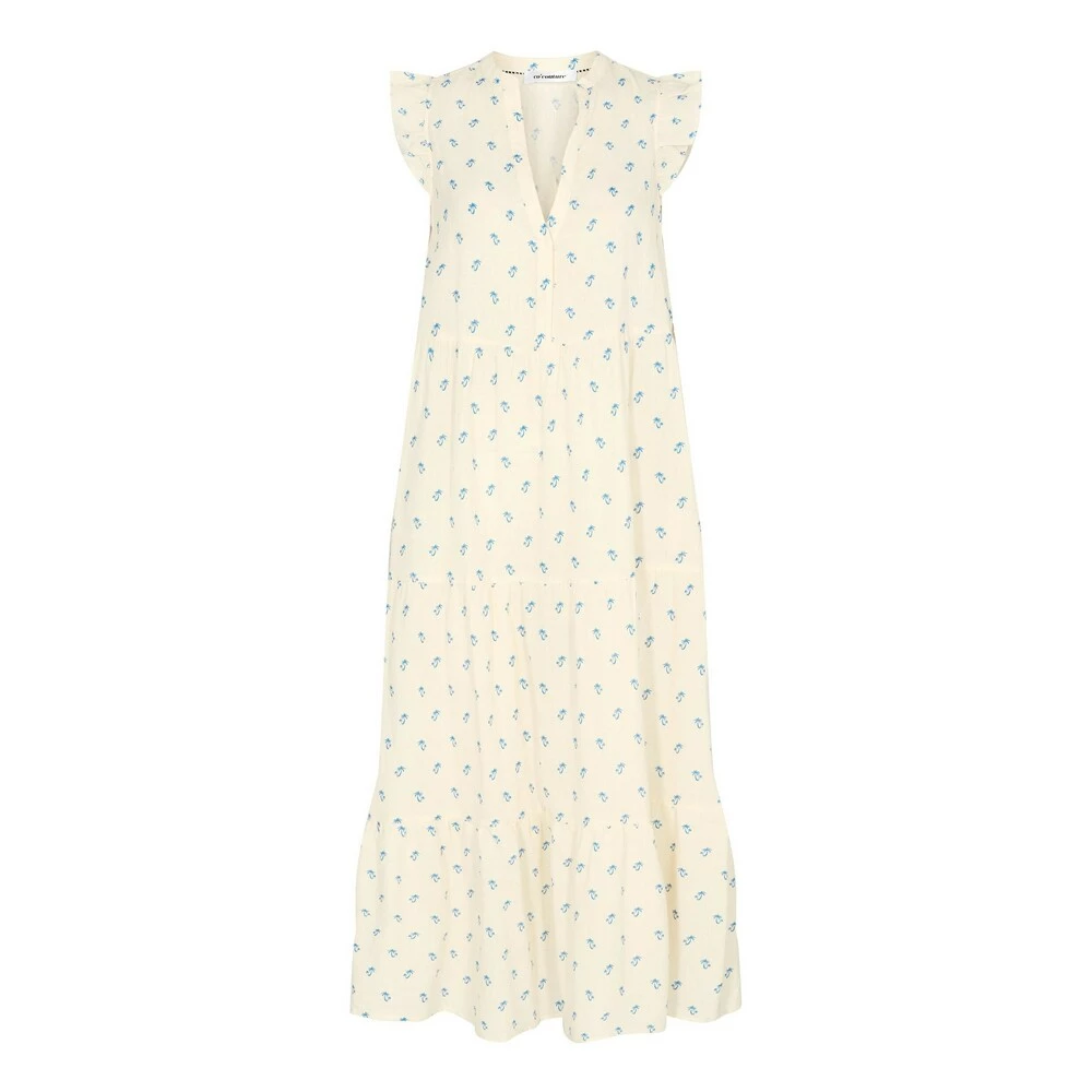 Løs og feminin maxikjole med volanger i off white og knallblått trykk med fine små palmer. Halsen er V og stroppene på kjolen har volangkant. Du må velge størrelse i henhold til din vanlige topp.