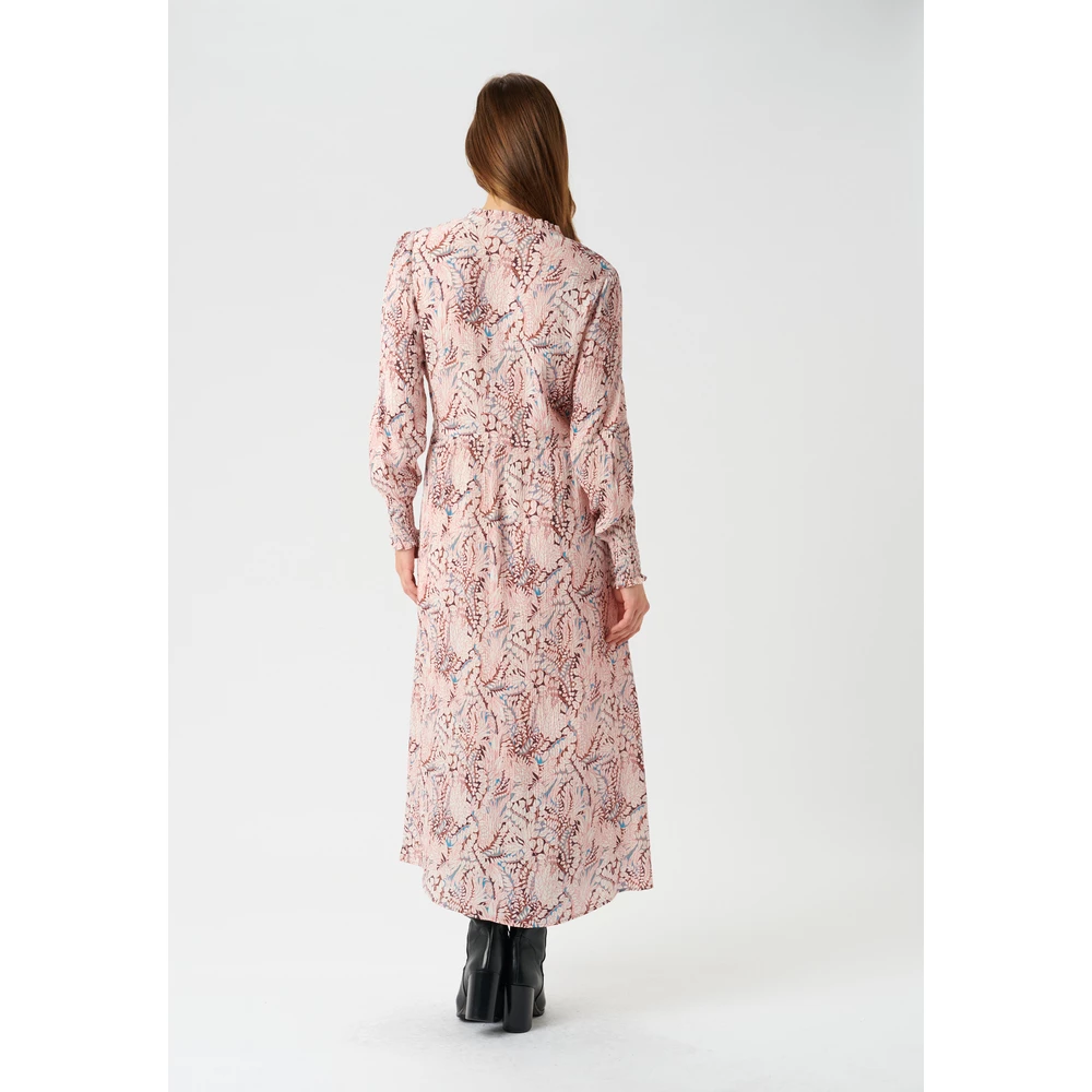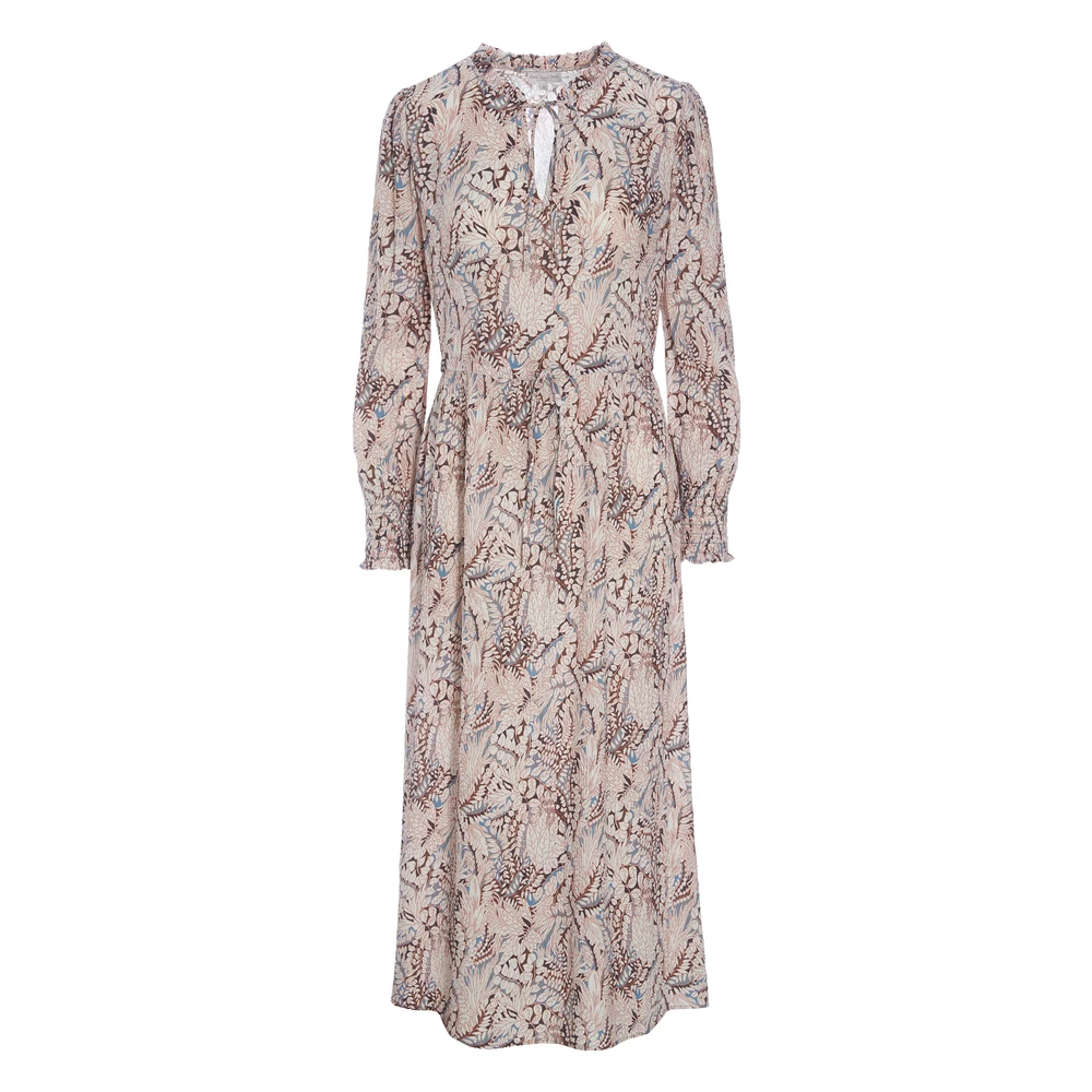 Kjolen har en ruffled stand-up krage med slipsdetaljer og et nøkkelhull foran. Den har en lang løsmontert erme, med flere små folder på skulderen og en bred smokk mansjett ved håndleddet. Kjolen er laget i et semifasset kutt på kroppen med et belte i midjen som kan brukes til å forbedre midjen. Fra midjen og ned er kjolen litt blusset og gir den en smigrende silhuett. Kjolen er under kneet.