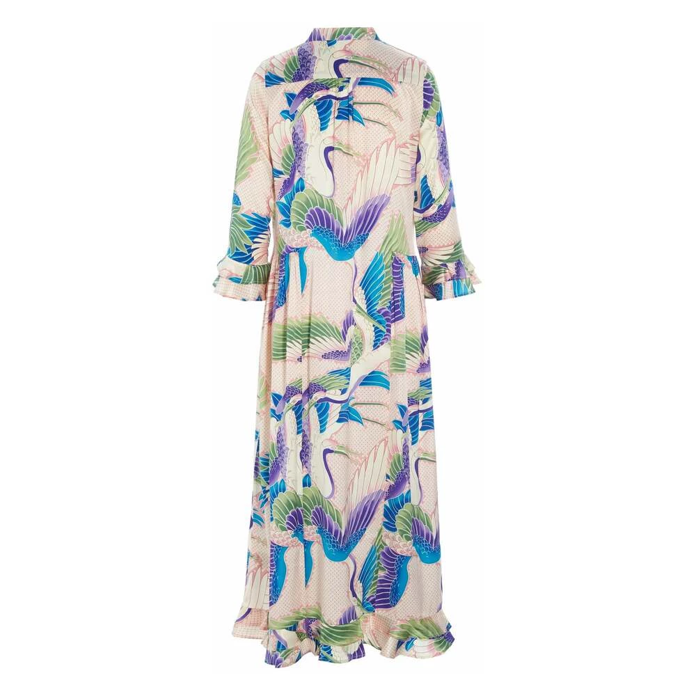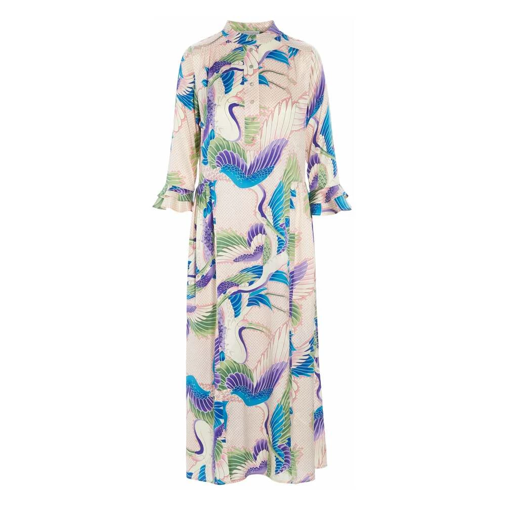 Midikjole med volangdetaljer, skjult stolpe og sidelommer. Materiale: 90% Silke, 10% Elastan Produktstil ID: 48-0122_5526 Denne beskrivelsen er oversatt automatisk.