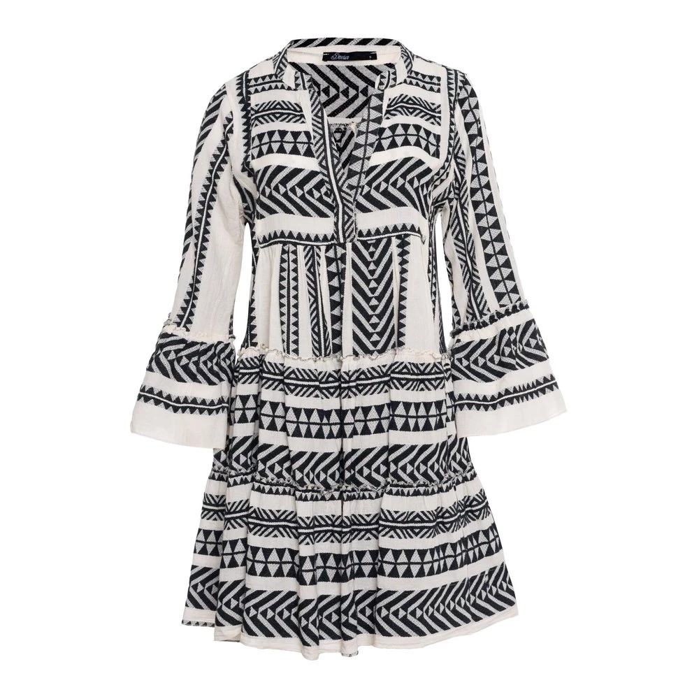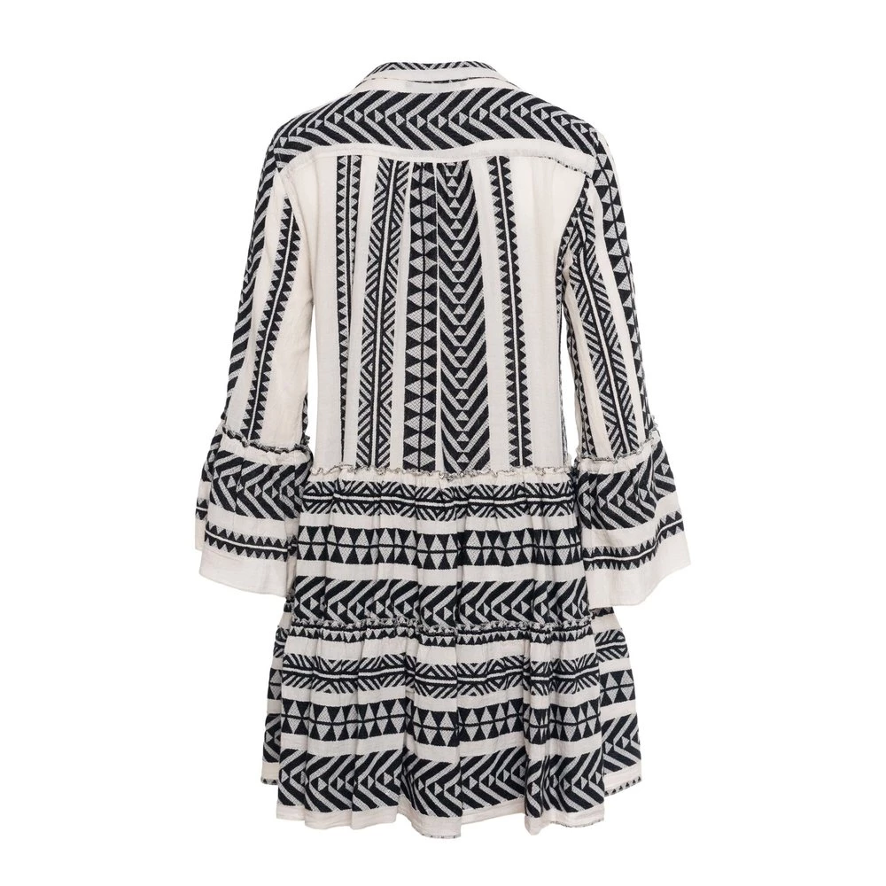 A-linje, tunika med v-hals med trykknapp, lange ermer, utsvingte ermeender med volangkant, lagdelt skjørt med volangkant, uforet finish.