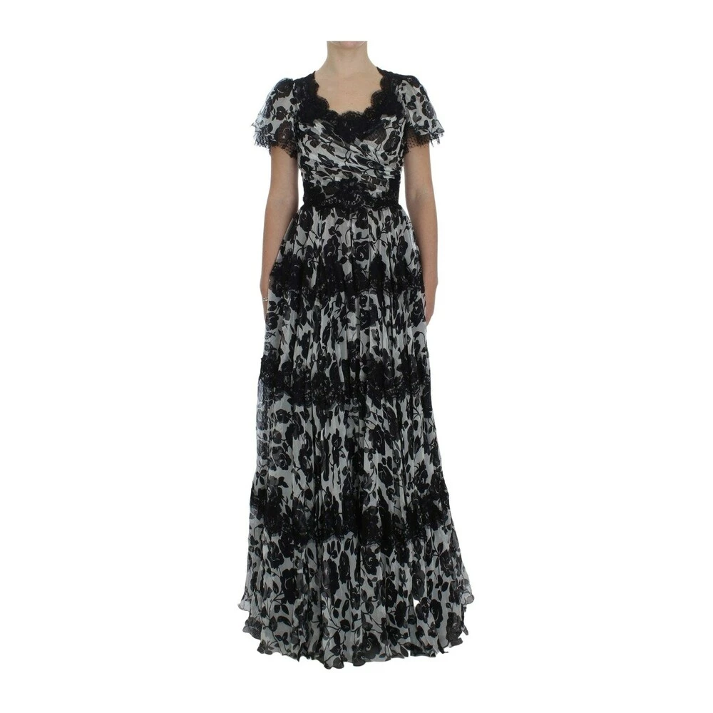 Dg nydelig splitter ny med tags, 100% autentisk DG svart og hvit floral print silke blonder og ricamo full lengde maxi kjole. Modell: Full lengde kort ermet Maxi kjole Farge: svart og hvit Blomster Skriv ut Tilbake Glidelås Lukk Logo Detaljer gjort i Italia Veldig eksklusivt og høyt håndverksmateriale: 80% Silke, 16% bomull, 4% Nylonfôr: 71% Nylon, 29% bomull