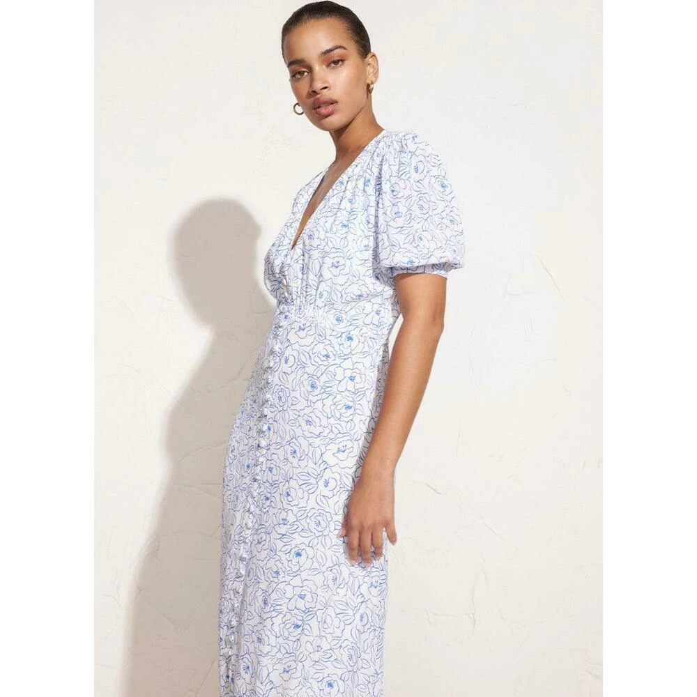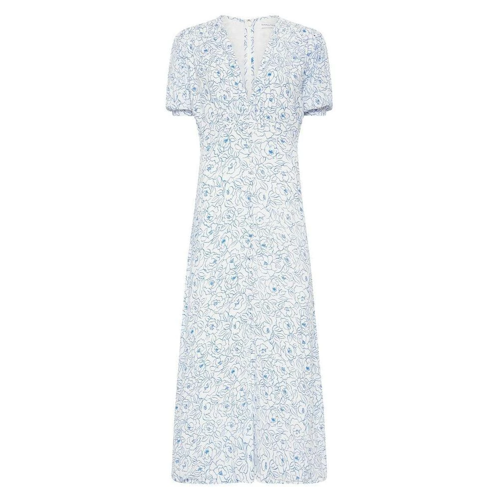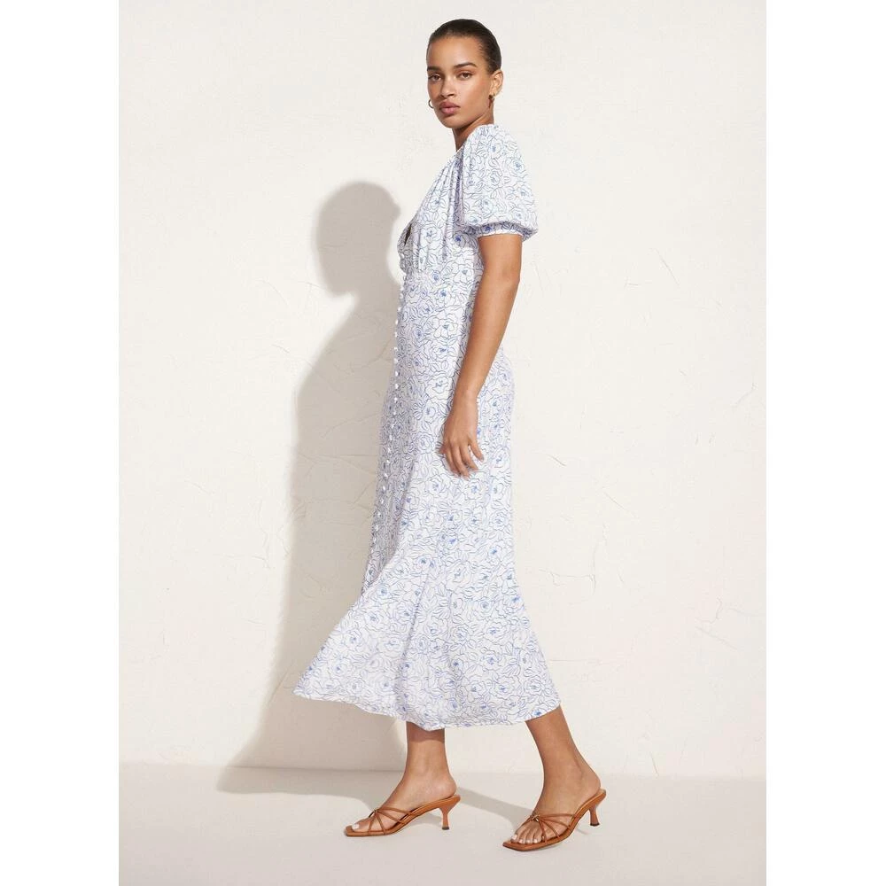 The Bellavista Midi Dress in blue Martine Floral is a key style in the Il Mediterraneo collection, featuring a V neckline, fixed waistband with self-fabric waist ties, feminine centre front split and finished with a floaty A-line skirt. Cut from 100% Rayon Crepe – FSC Certified Fibres. This dress is perfect paired back with a white strappy heel for your next spring soiree. Nisaa is wearing a size Small and her measurements are Height: 176 cm, Bust: 82 cm, Waist: 58 cm, Hips: 90 cm. We recommend sizing down in this style. 100% RAYON CREPE – FSC CERTIFED FIBRES
