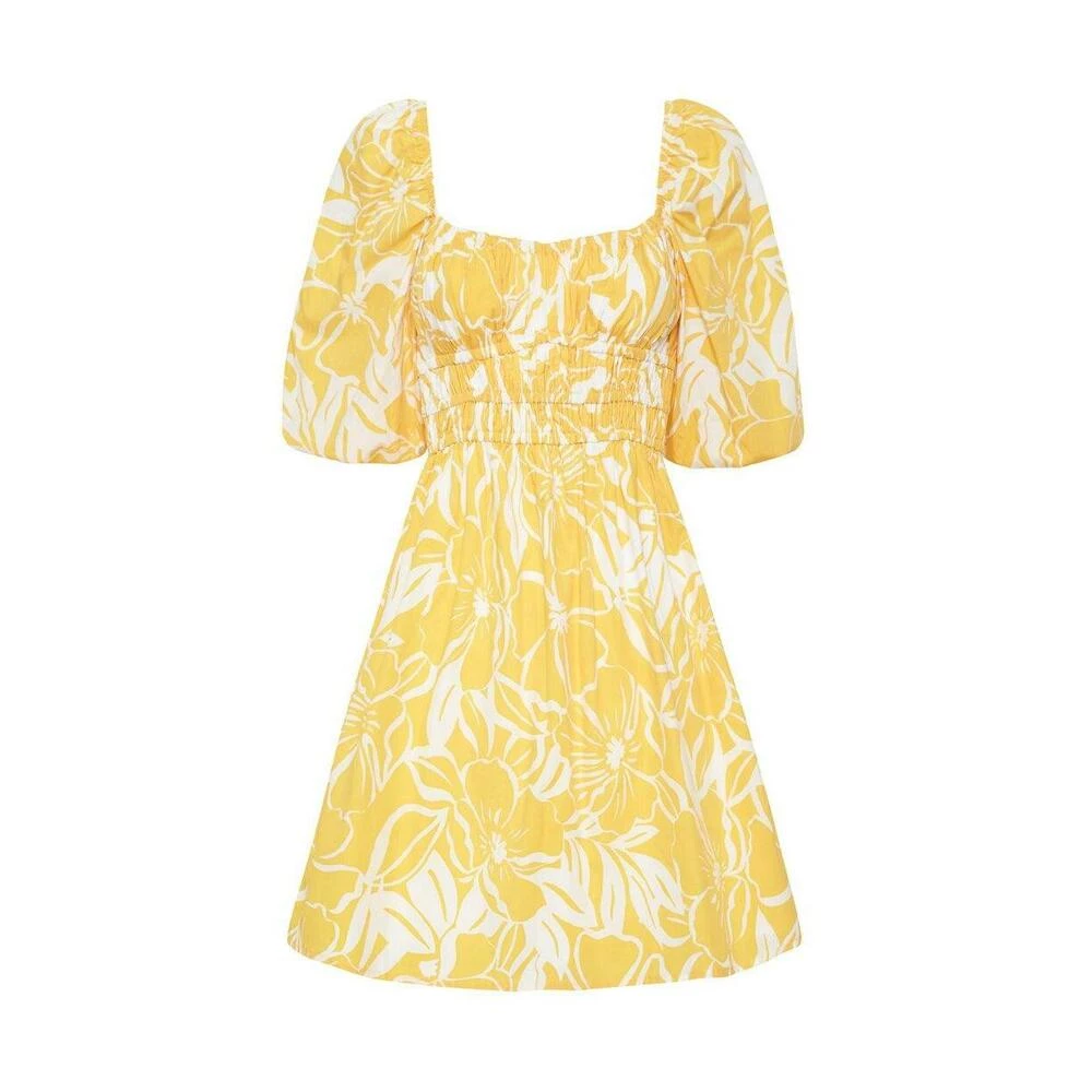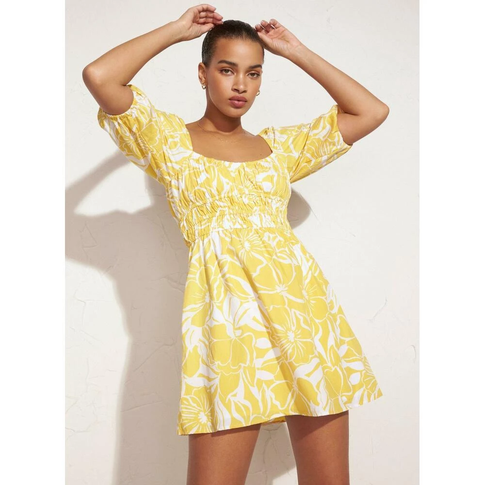 This structured mini in our hand-printed Marigold Marsa Floral Print will be on high rotation for seasons to come. With gathered detailing on the bust, delicate elasticated puff sleeves and elasticated seams in both the waistline and bodice, the Marinelli Mini Dress is equally flattering as it is easy wearing. Cut from a crisp Cotton Poplin – OEKO-TEX100® Certified. Nisaa is wearing a size Small and her measurements are Height: 176 cm, Bust: 82 cm, Waist: 58 cm, Hips: 90 cm.