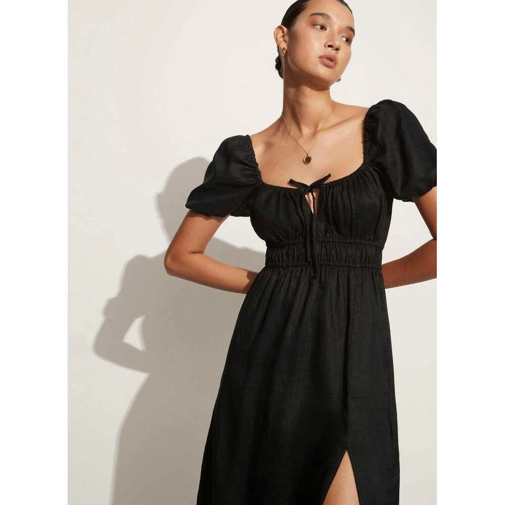 Cut from environmentally gentle and breathable Linen – EUROPEAN FLAX® ; OEKO-TEX100® Certified, the Terina Midi Dress in Plain Black speaks to effortless femininity. The easy wear style features delicate elasticated sleeves, front split, playful tie detailing on the bust and elasticated seams in both the neckline and bodice for ease of fit. Fully lined, pair yours back with your favourite strappy sandals. enny is wearing a size Small and her measurements are Height: 178 cm, Bust: 80 cm, Waist: 61 cm, Hips: 88 cm. LINEN – EUROPEAN FLAX® ; OEKO-TEX100® CERTIFIED This garment is hand-made, hand-dyed and hand-printed in Bali, Indonesia. Due to this hand-made process each piece is unique and there can be slight irregularities in the print and colour of the garment. To ensure a long lasting garment life whilst caring for the environment please follow these instructions: Hand-wash in cold water or use lower temperature washes and delicate spin cycles. These care processes are more gentle on the garments and help to protect the colour, shape and structure of the fabric whilst reducing the amount of energy used. Avoid bleach and use environmentally friendly detergents. Avoid tumble dry and hang dry where possible. This saves electricity and avoids fibre degradation. Cool iron when needed.