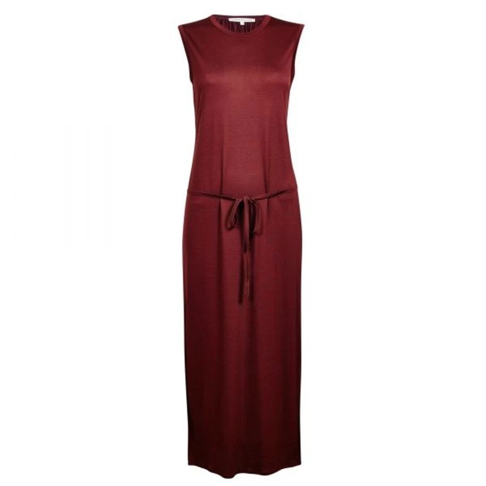 Nydelig kjole i burguderrød farge. Kjolen er fotsid med splitt i siden. Modellen har også knyting i livet. Består av 88% viskose og 12% polyester. Bør vaskes i maskinen på kaldt vann.