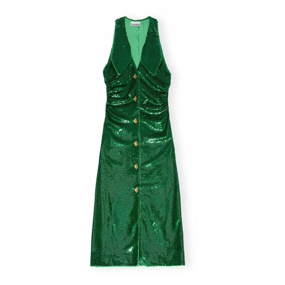 Kjole med v-utringning, unik diamantformet krage og full gullknappestolpe.