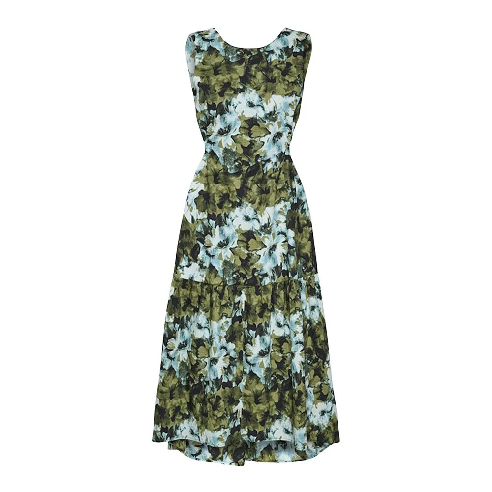 Nydelig kjole fra Gestuz med feminin og klikk silhuett, rund hals og vakker utskjæring i ryggen hvor den også knytes med en liten snor. Kjolen har også et kuttet blomsterprint i blåse og grønne nyanser. Så fin til både sandaler, strarrows og høye.
