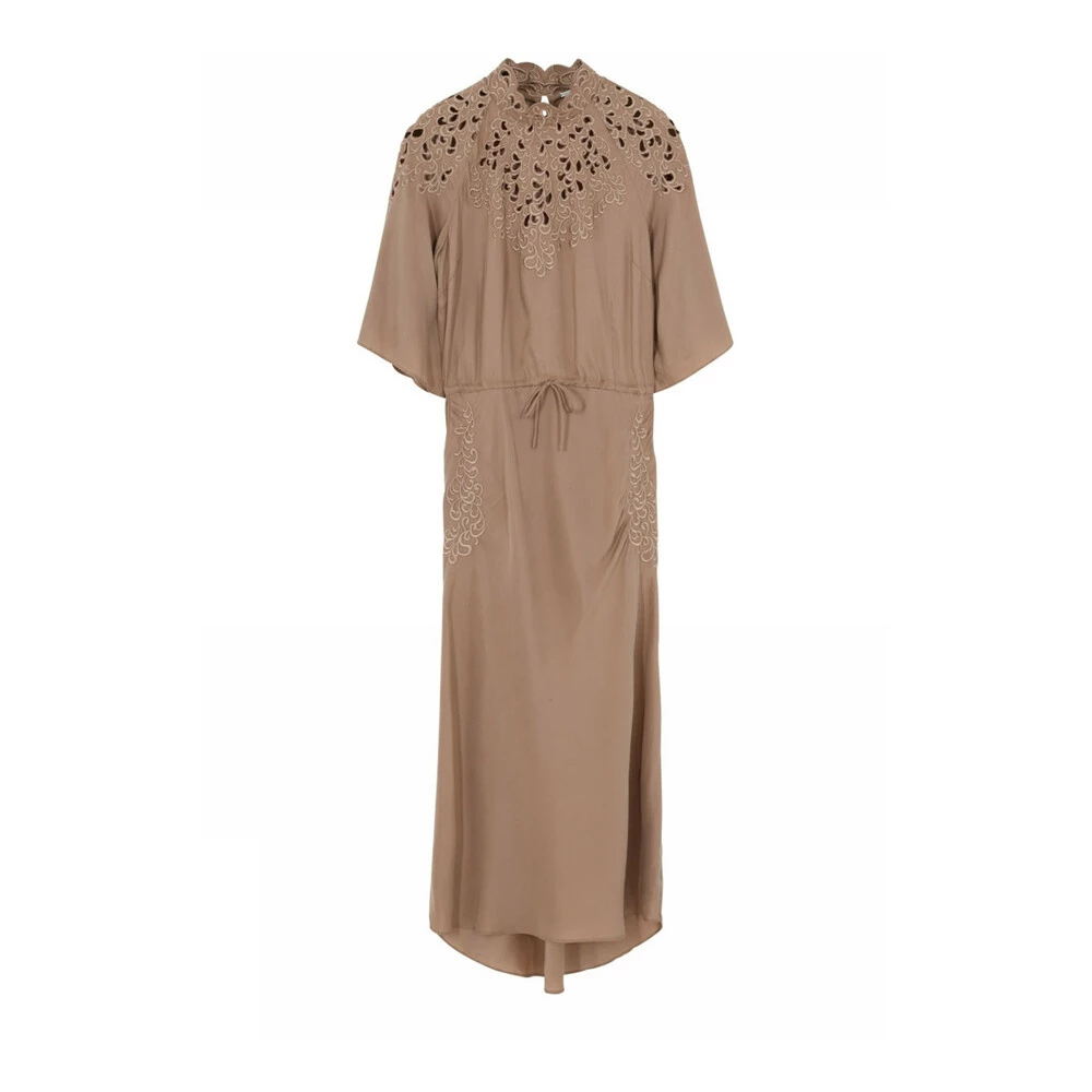 Vakker kjole fra Gustav med ½ lange vide ermer og vakkert brodert pynt over brystet, skuldrene og sidene med fint perforert mønster. Kjolen har også et smalt knytebånd for å fremheve midjen.