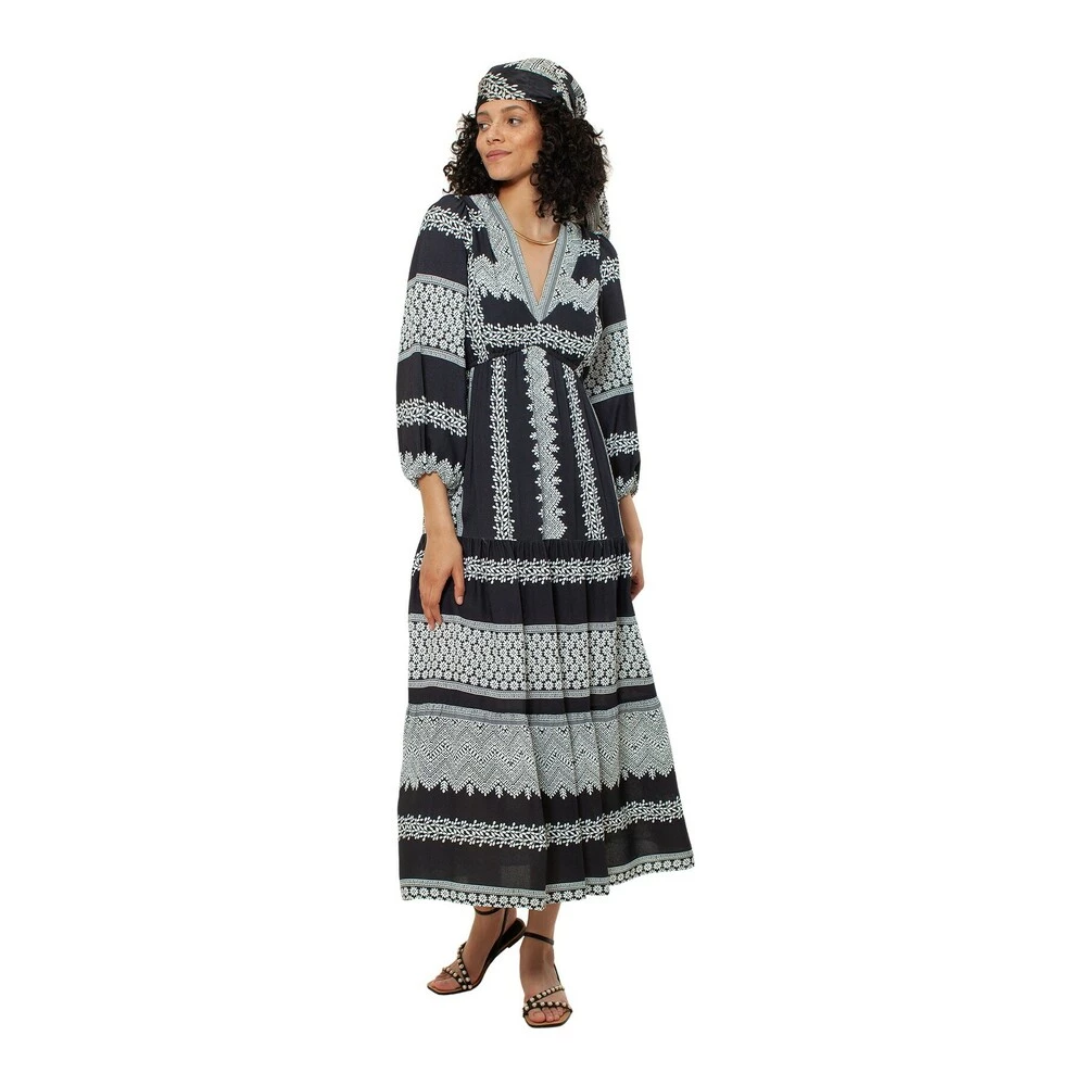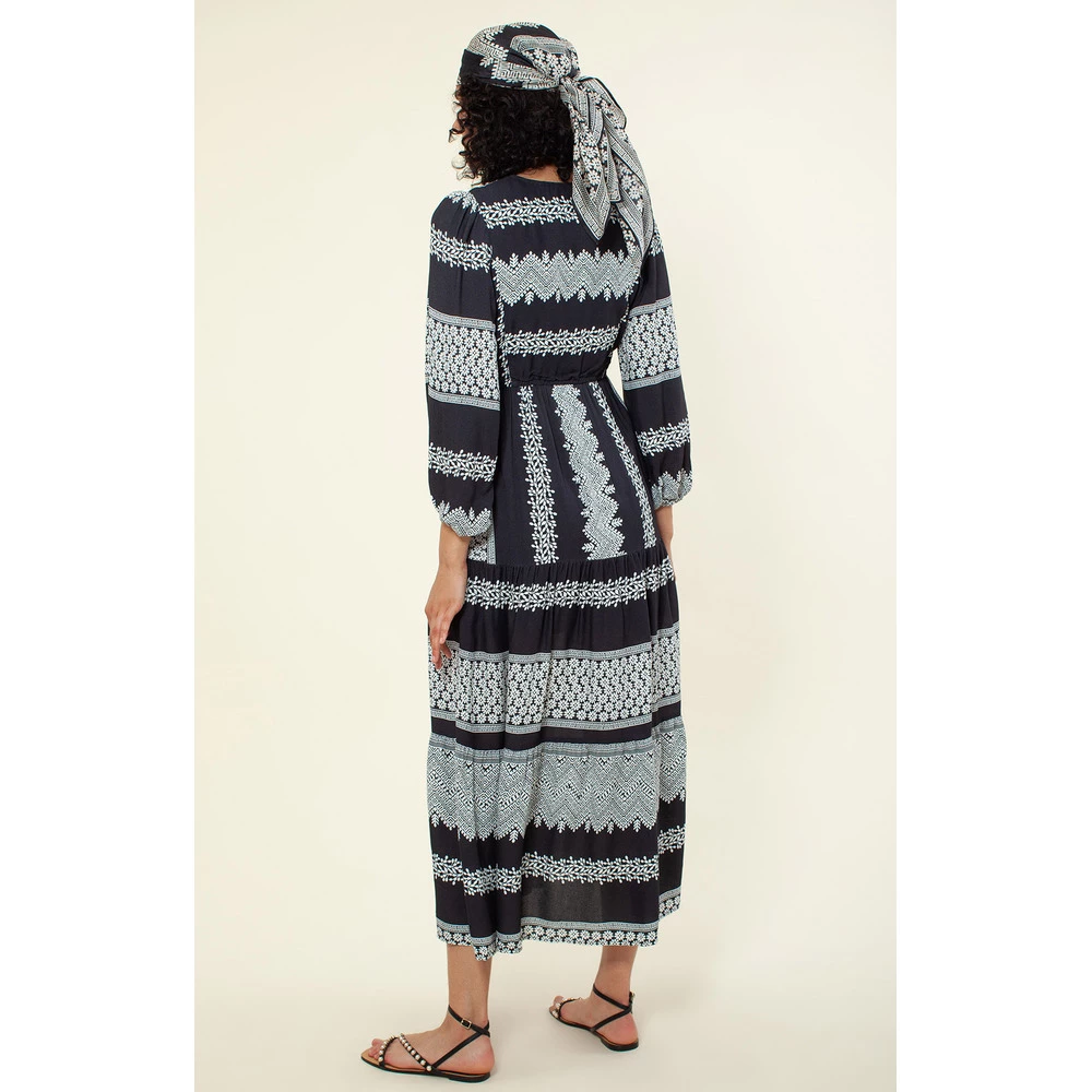 Superfin maxikjole fra Hale Bob i sort og hvit. Veldig kult mønster. Kjolen er printet. V-utringning og elastisk strikk under livet.