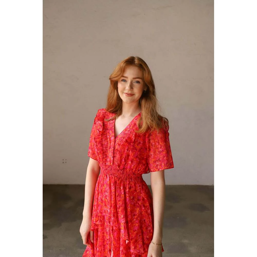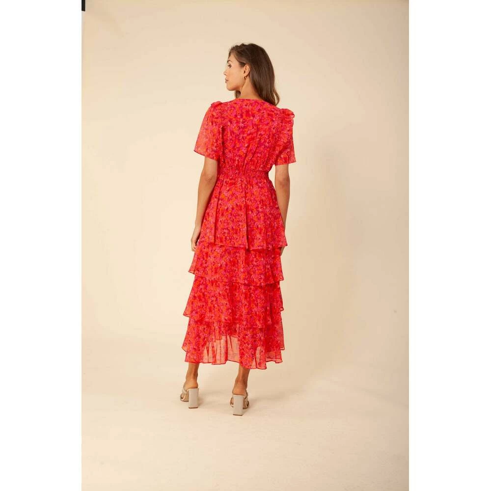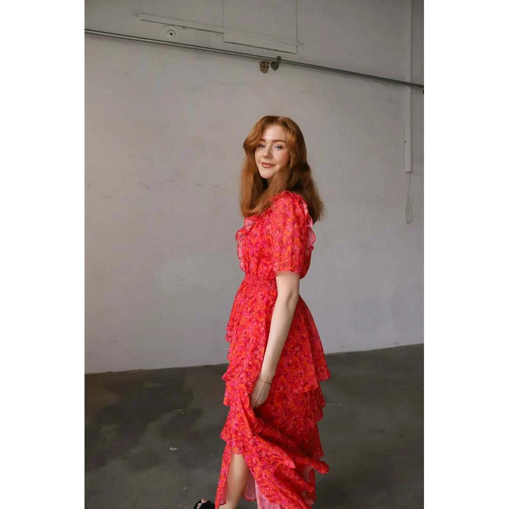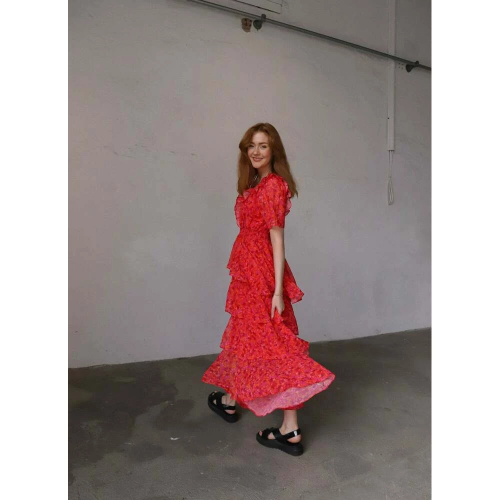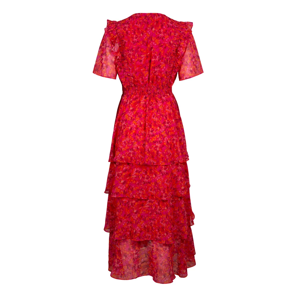 Microfiber Chiffon, kroppen er fôret, volang i halsen, puffermet ender over albuen, lagdelt skjørt med splitt i nedre lag.