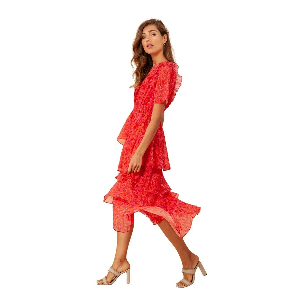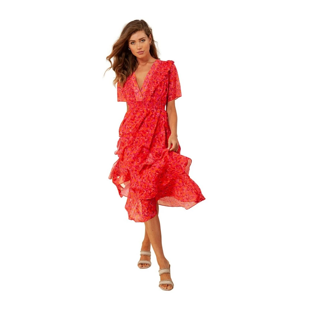 Nydelig kjole fra tail bob i lys chiffon. Kjolen har V-rens, korte løse ermer, strikk under brystet og kutt på skjørtet. En feminin og flatterende kjole for en festlig anledning