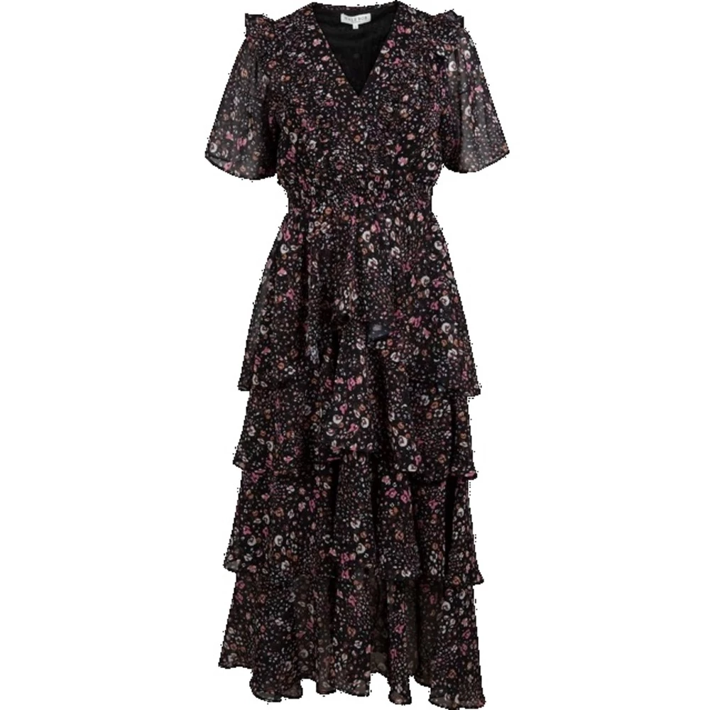Nydelig maxikjole med fantastisk print i sort med søte blomster i oransje, rosa, creme og brunt. Kjolen har volanger langs halsen og over skuldrene og lagdelte skjørt med splitt nederst. Søte puffs, dyp V-hals og elastisk midje.