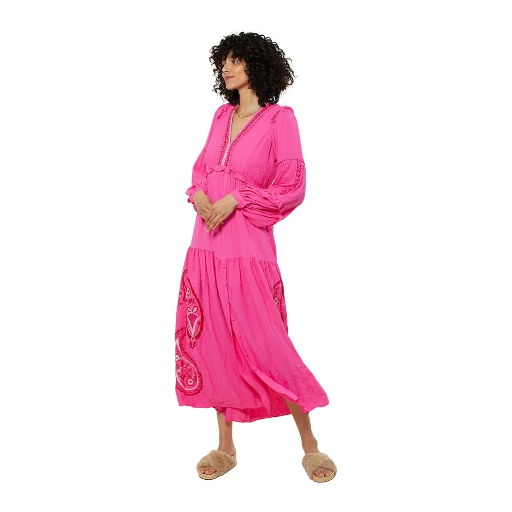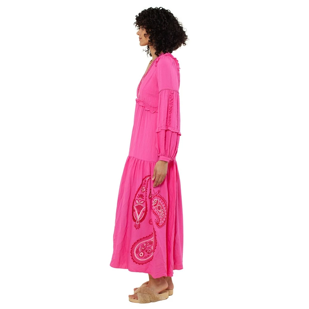 Lekker maxikjole fra Hale Bob med broderidetaljer i sølv, rød og rosa. Lange ermer og V-hals. Kvalitet: 55% viskose, 45% rayon Vask: Rens