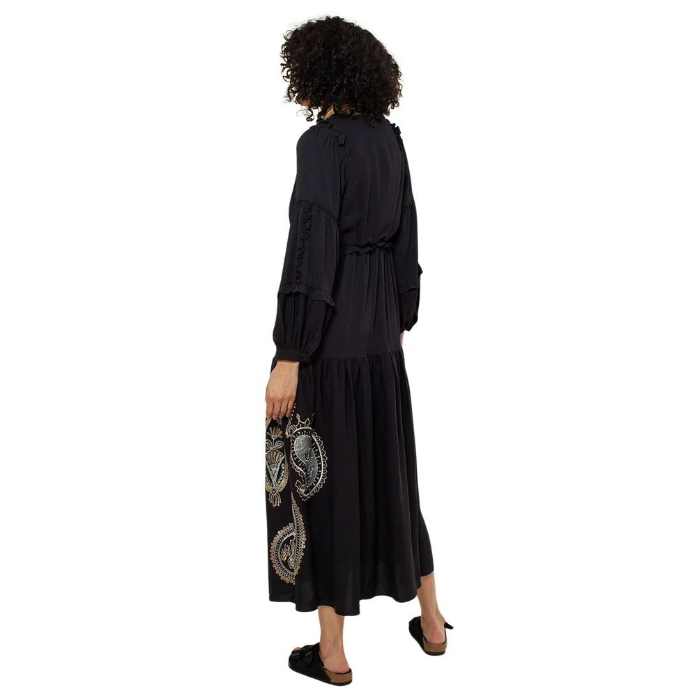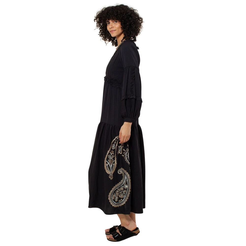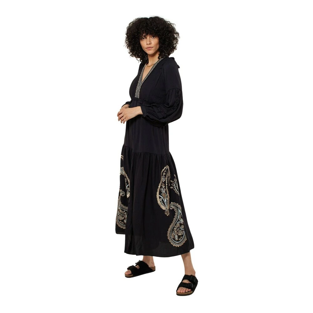 Lekker maxikjole fra Hale Bob med broderidetaljer i gull, sølv og hvit. Lange ermer og V-hals. Kvalitet: 55% viskose, 45% rayon Vask: Rens