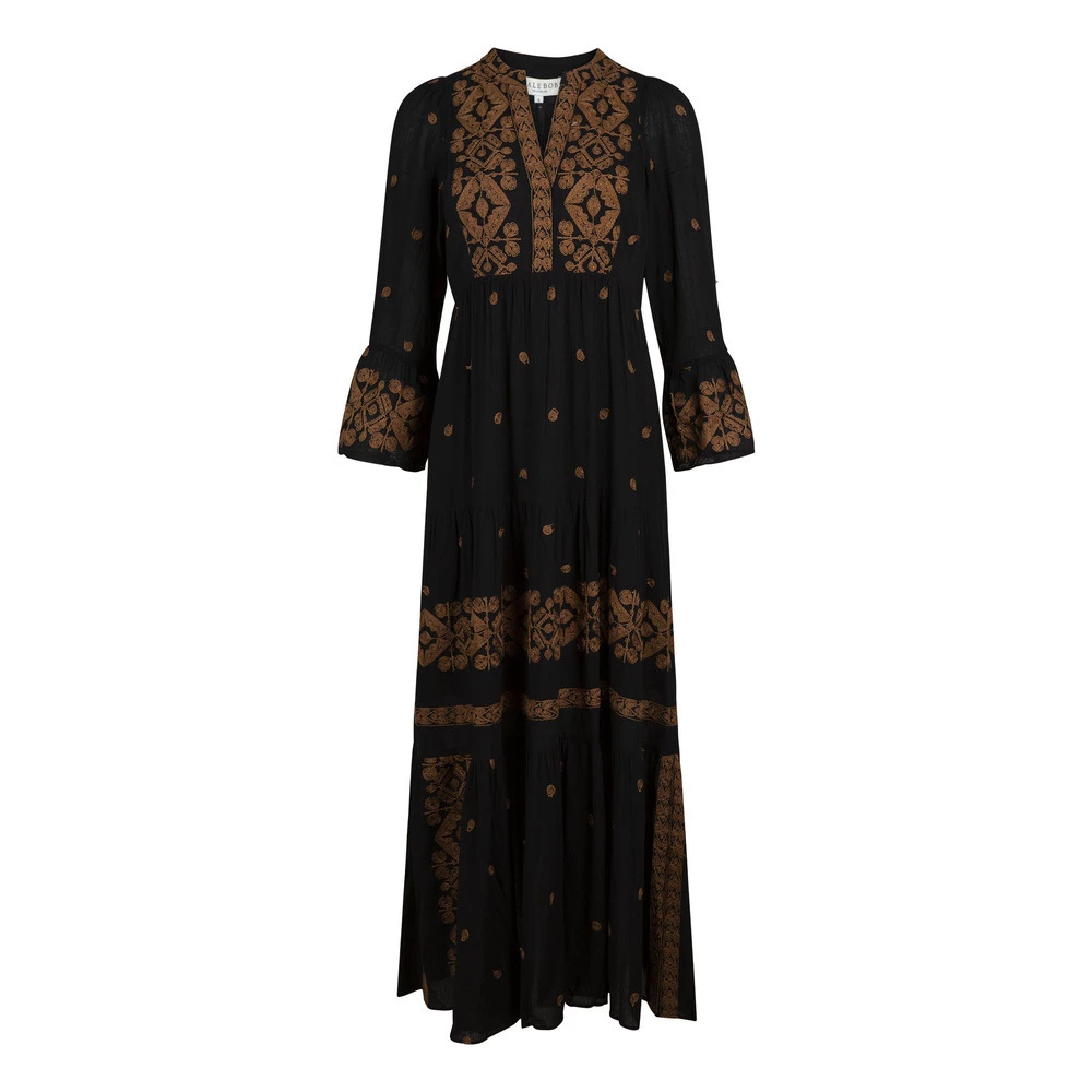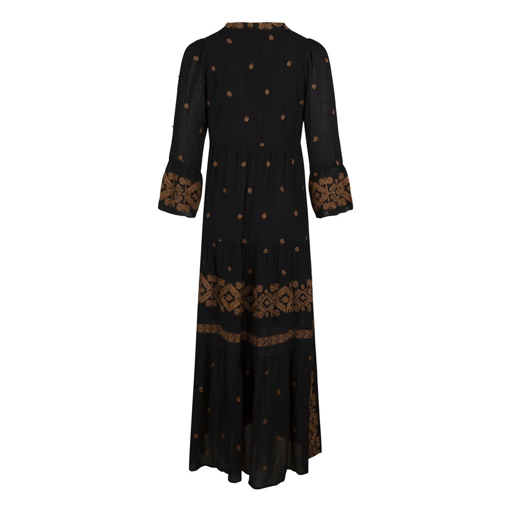 Marja Long Dress fra Hale Bob. Nydelig kjole fra Hale Bob med vakre broderidetaljer. Marja Long Dress har detaljerte brune broderier på en tidløs sort basefarge. Kjolen er lang og har 3/4 lange løse ermer og en innsvingt passform med A-formet maxiskjørt. Den perfekte kjolen som du enkelt kler opp eller ned. Kjolen er fôret.Materiale: Viskose