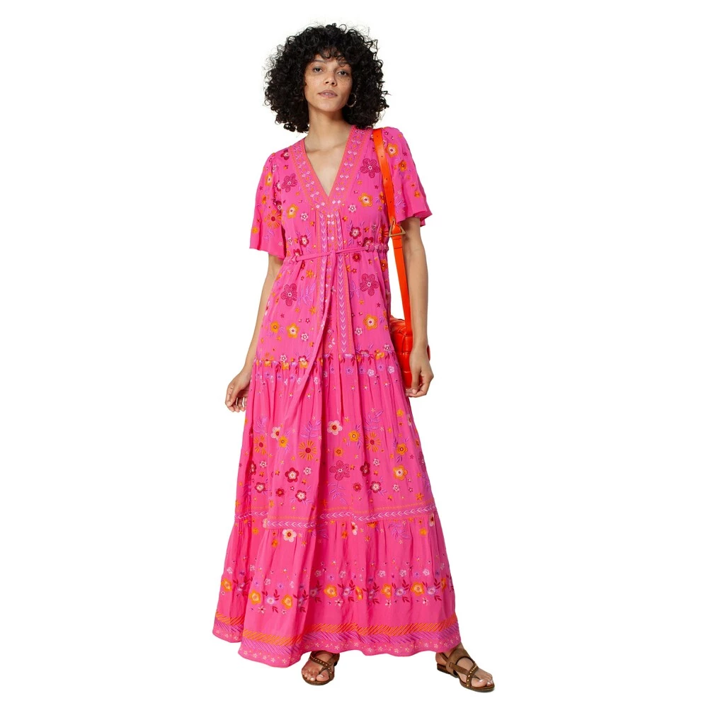 En vakker kjole fra Hale Bob i nydelig flerfarget broderi. V-hals, korte ermer og full lengde. Løs og avslappet kjole.
