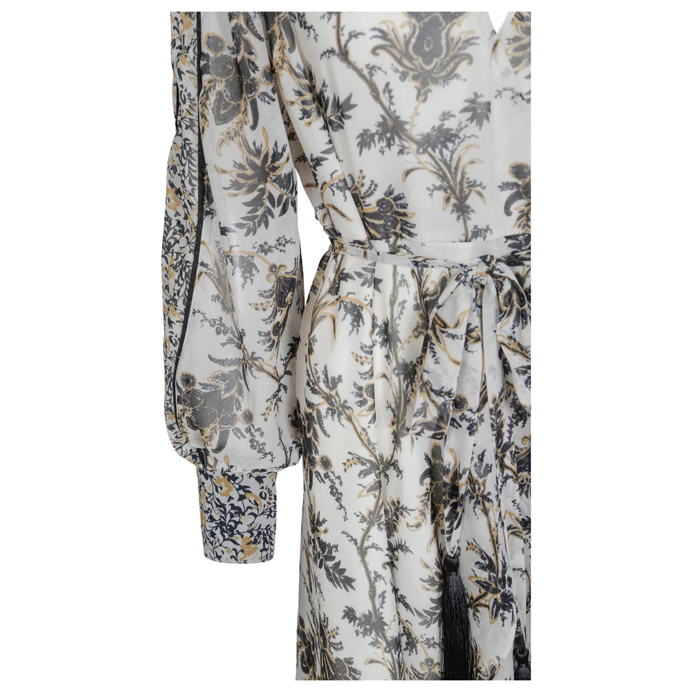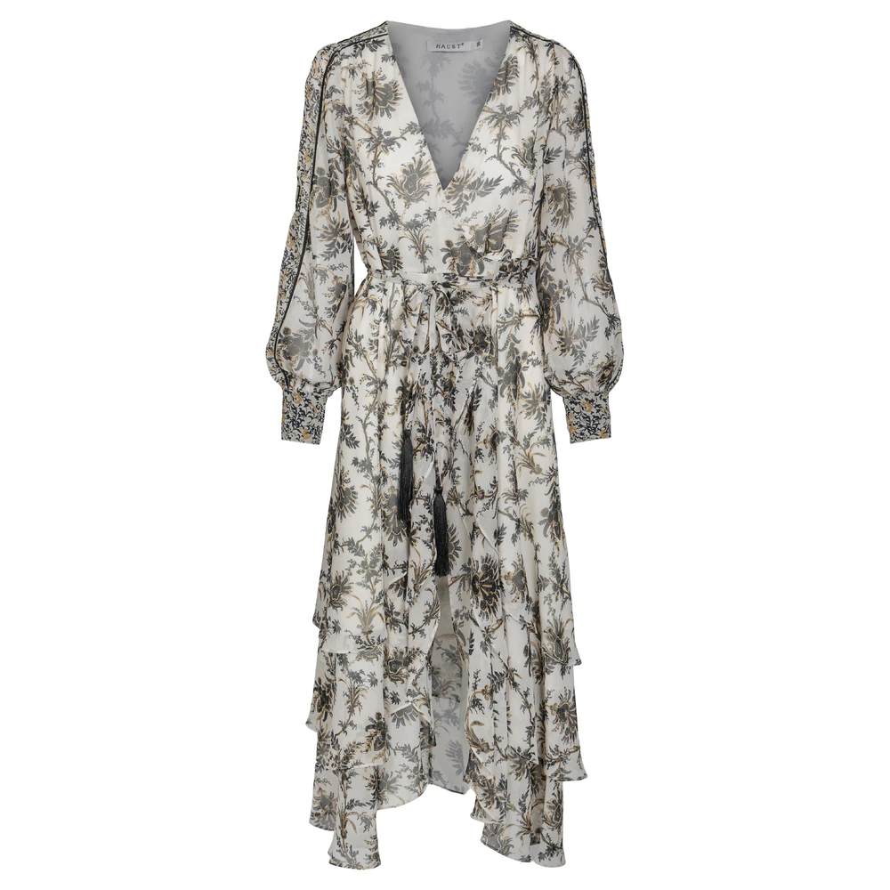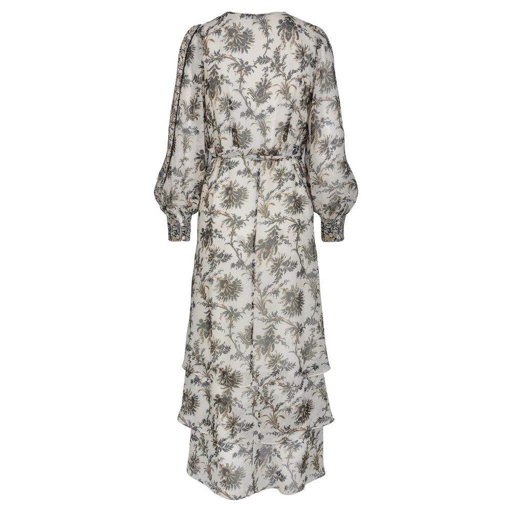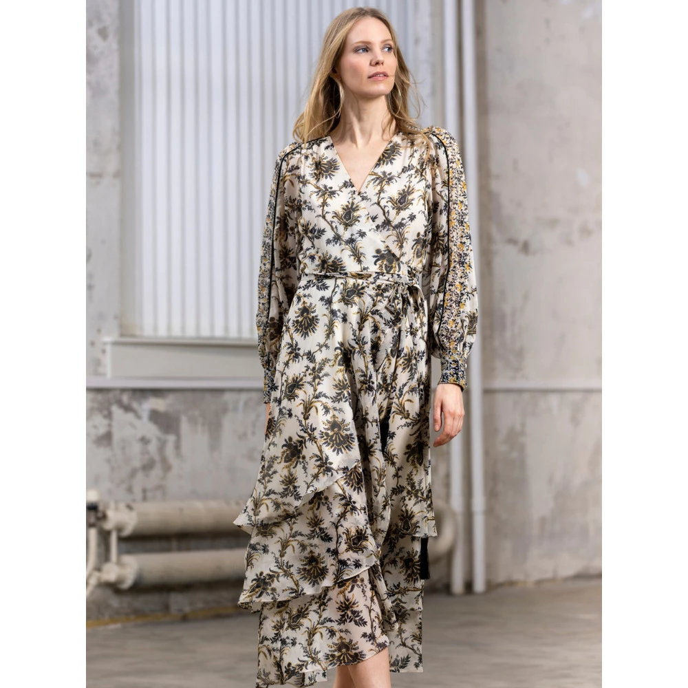 Klar for høstens selskaper i denne flotte, lange knytekjolen i vakkert print med okergule detaljer. Kjolen er foret og har tre lag med volanger som gir den et nydelig fall. Vide ermer som er lett transparente. Cuffene har to knapper som er hektet med elastiske hemper. Modellen er 1.79 cm og har på seg størrelse 36. Rayon 50% Polyester 50%