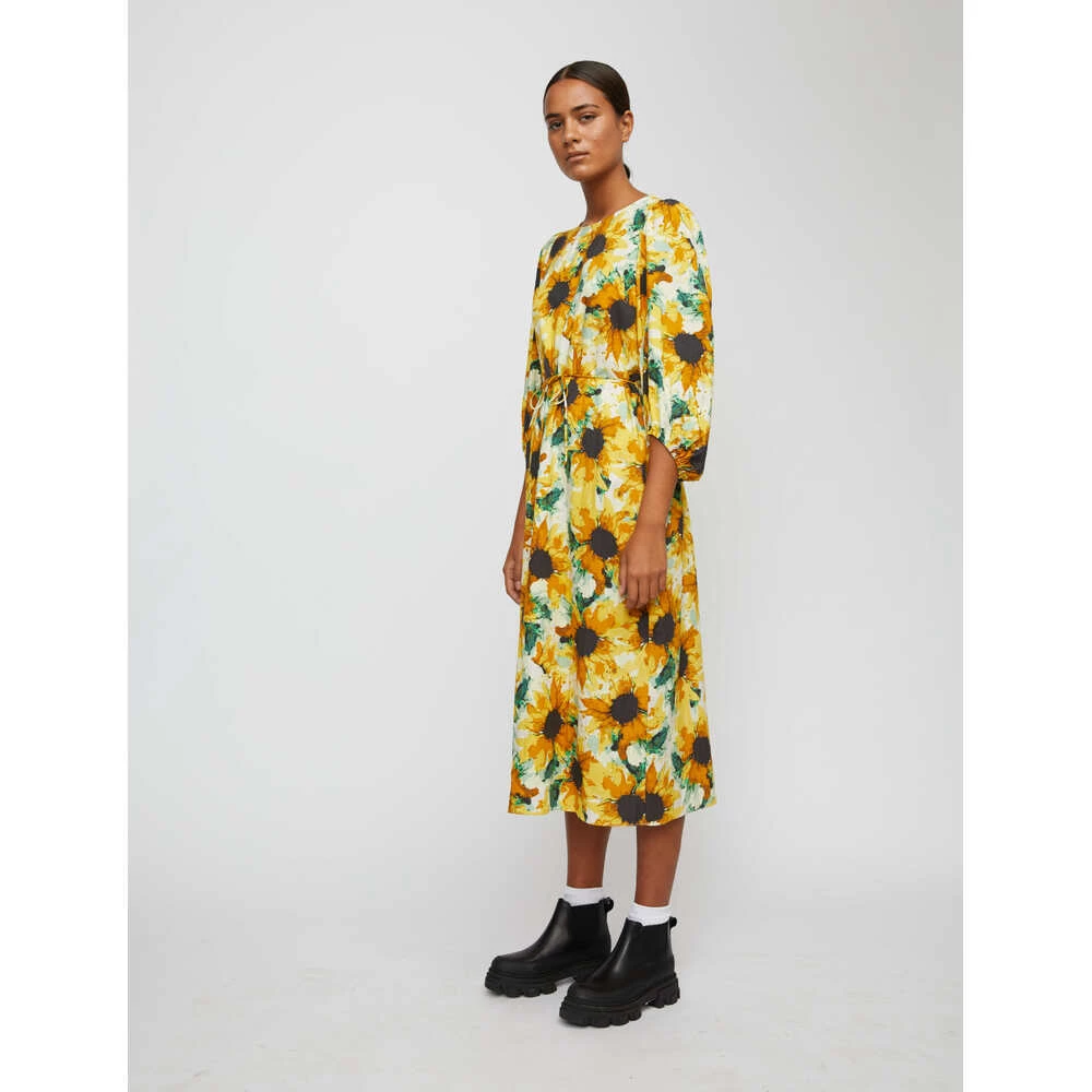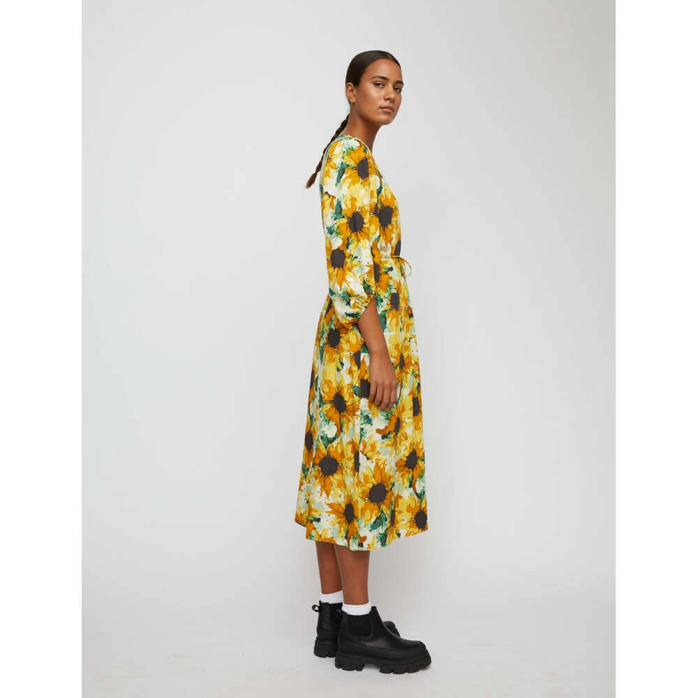 Flott kjole laget av en Lenzing viskose- og nylonblanding med solsikketrykk over hele verden. Den har rund hals med splitt og knapp bak i nakken og rett passform med splitt bak. Kjolen har også et tynt bindebelte og ¾-ermer med elastiske mansjetter for et lett volum. Vår lekre modell er 180 cm høy og bruker størrelse 36/S. Bukser i Lenzing EcoVero viskose og nylon Rund hals Rett passform med knytebelte Lett voluminøse ¾-ermer En del av vårt BÆREKRAGT VALG-initiativ