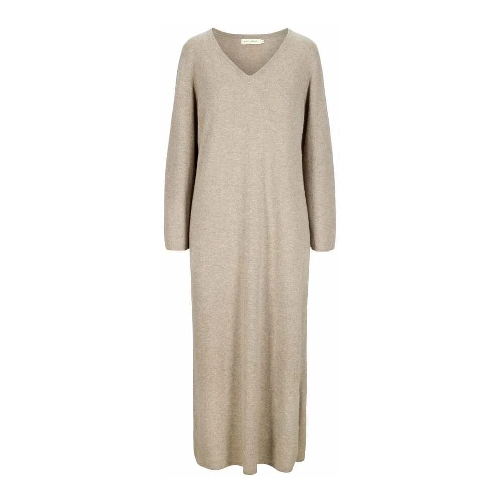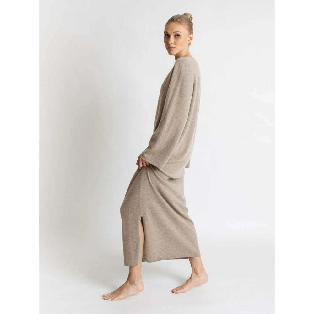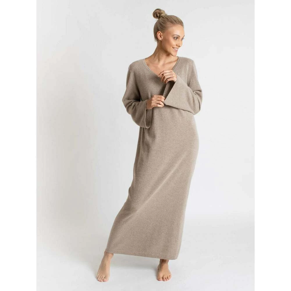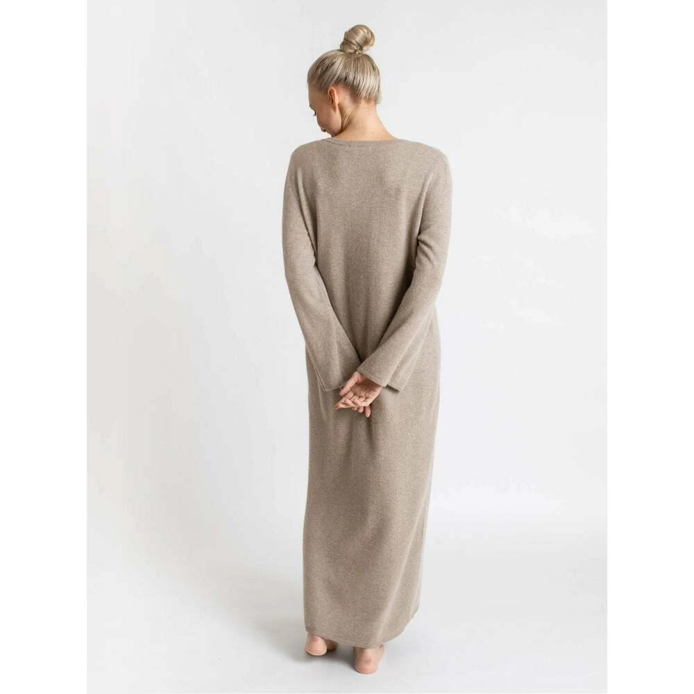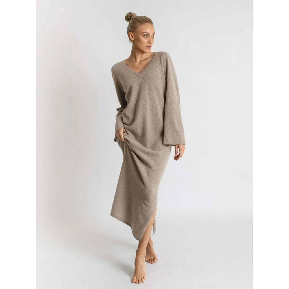 Kashmirkjole Bohéme maxi Favoritten Bohéme maxi er en lang og bohemsk maxikjole i 100% kashmirull med diskrete detaljer som gir følelsen av max komfort og max luksus. Kashmirkjolen er fotsid, med splitt på ene siden. Modellen er romslig og komfortabel og med en v-hals som viser hud og gir en feminin følelse og look. Kashmirkjolen er laget i 12 gauge og alle endinger er doble, noe som gir vår mest holdbare kvalitet og et ekstra fint fall. Kashmirkjolen er både varm og trendy, bruk den på kontoret, på venninnekveld eller stash den opp til fest. Modellen er 173 cm og har på seg str S