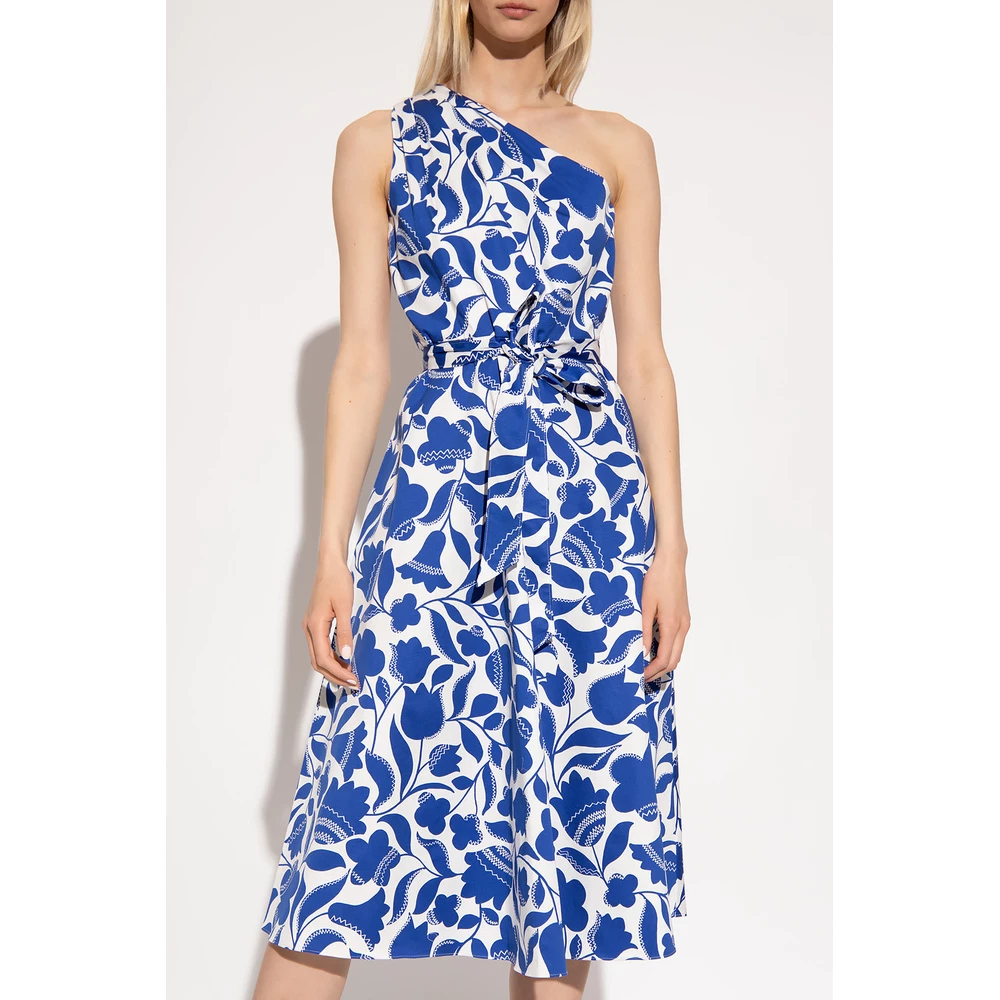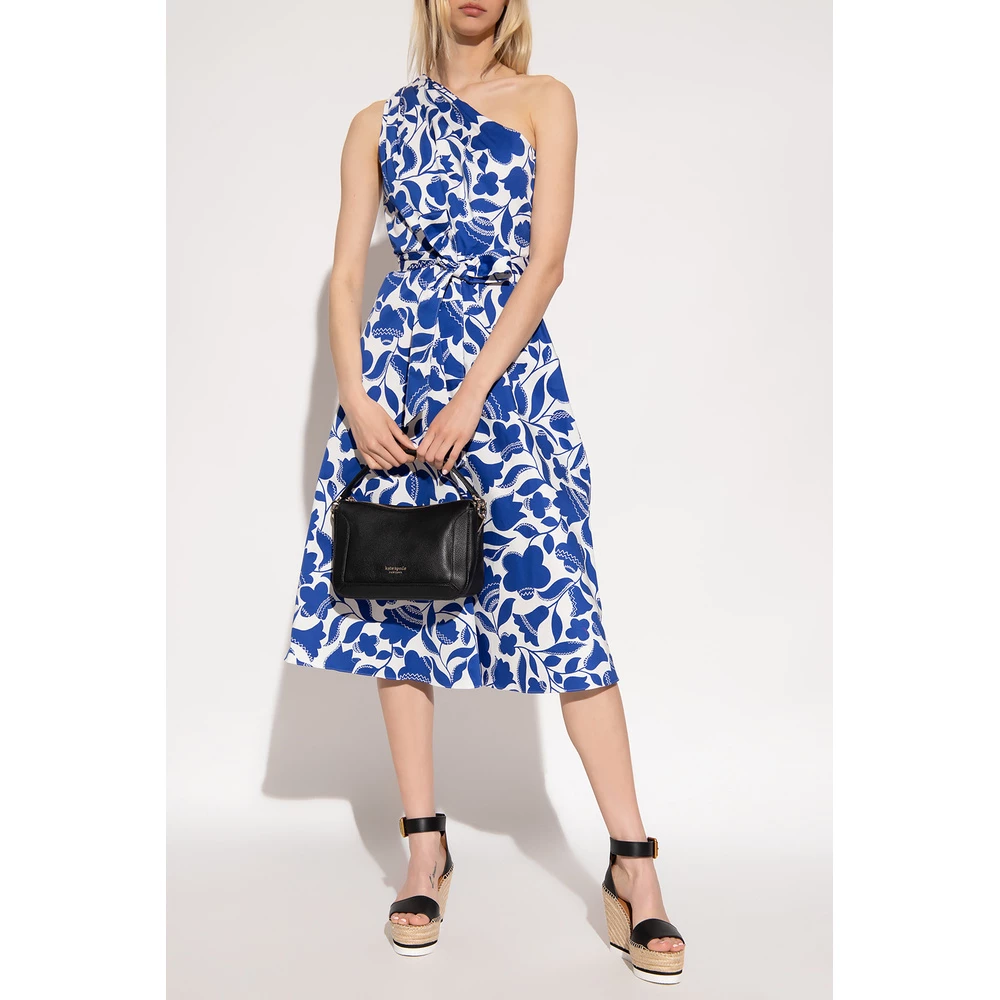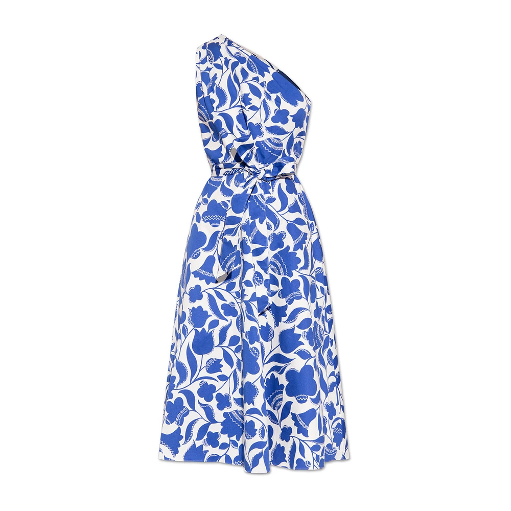 Hvit og mørkeblå kjole med en skulder fra Kate Spade. Denne stilen er laget av bomull og viser et blomstermønster. Den er komplett med en skjult glidelås på siden, en blusset hem og et festet midje-hinkbelte.