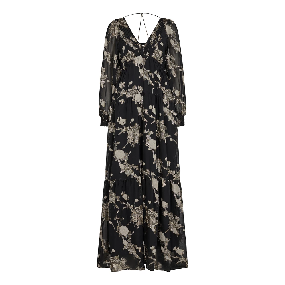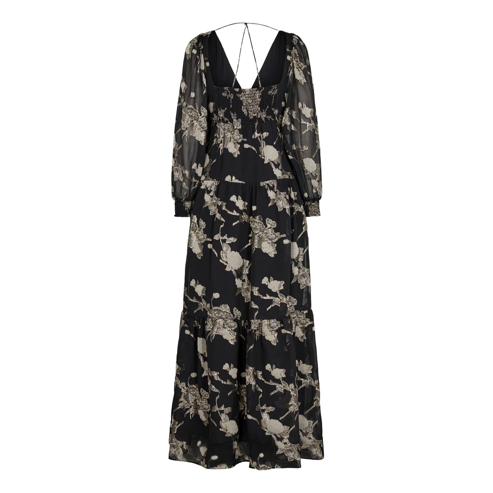 Kjolen har en V-pengelinje foran og en firkantet utringning bak, bredde en stropp over baksiden som forhindrer at kjolen glir nedover skuldrene. Langs halsen foran er det en vakker plissert detalj, som bryter opp blomstermønsteret. Kjolen har en løs ren erme med en smock mansjett som samler ermene på håndleddene. Det er tre buede sømmer over kroppen der ekstra bredde er lagt til kjolen som gir kjolen en løs og flytende silhuett. Kjolen er laget i gulvlengde.