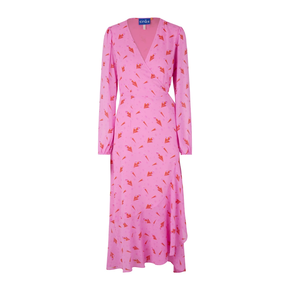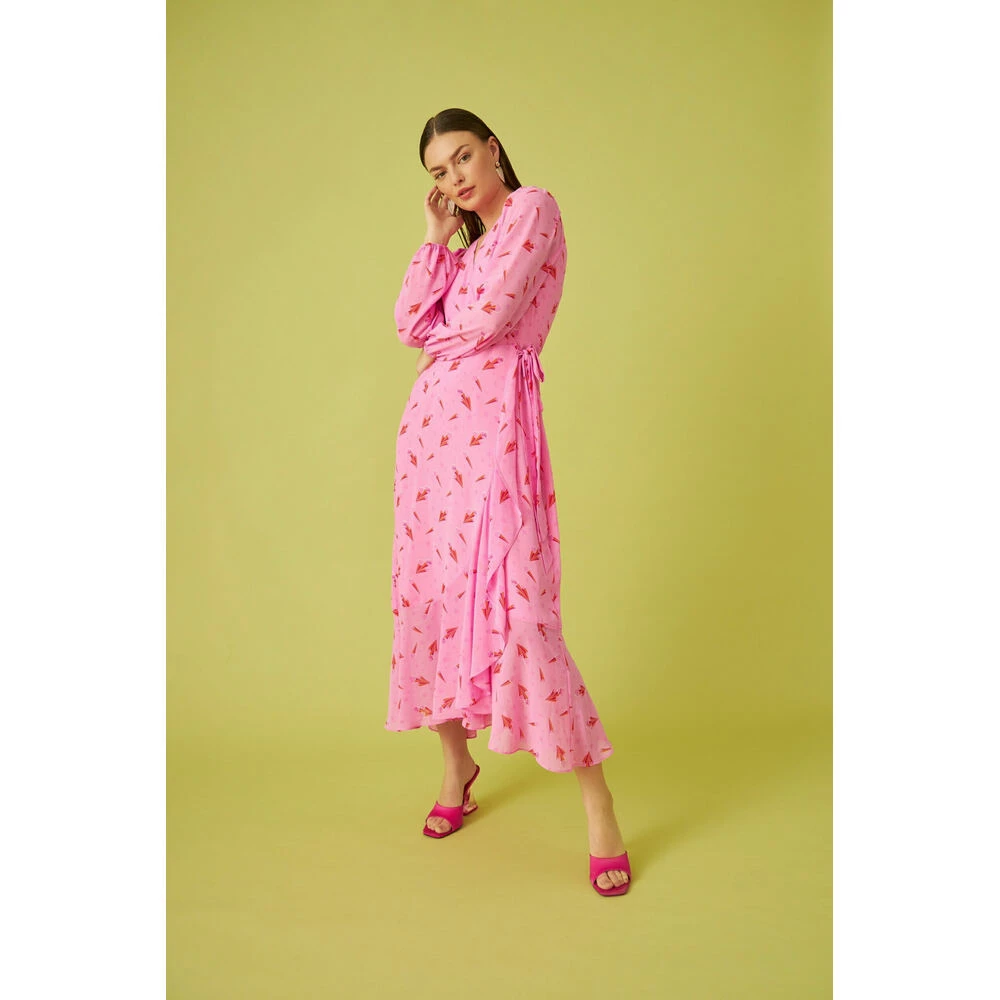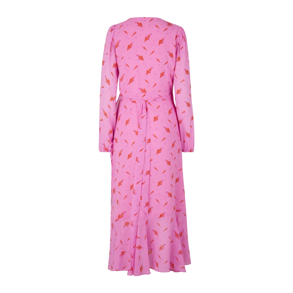 Kjolen er laget i en innpakningsstil med en lang løs erme som har en slank elastisk mansjett som samler hylsen ved håndleddet. Kjolen har et belte i midjen som kan brukes til å style kjolen annerledes, avhengig av hvor mye du vil forbedre midjen. Kjolen har en under knelengden.