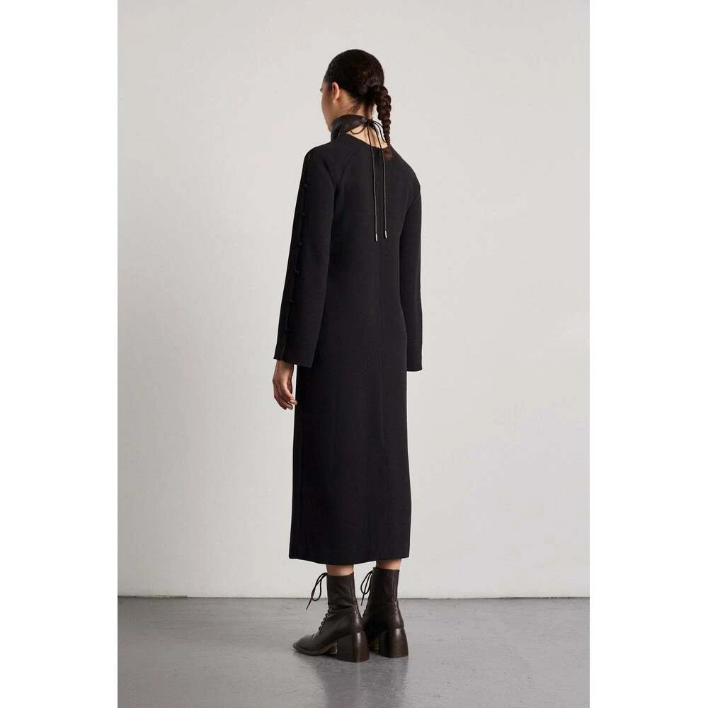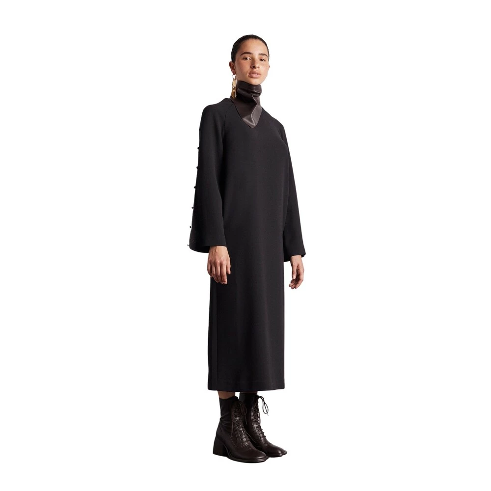 Devyn Long Sleeved dress fra Mark Tan er den ultimate lille-sorte å ha i klesskapet. Kjolen er tidløs og passer seg godt til anledninger året rundt. Kjolen har en lengde som strekker seg ned til midten på leggen. Videre har den rund hals og lange ermer med splitt og stoffkledde knapper. Her kan man leke seg med å både ha knappene åpen og lukket for en allsidig look. Kjolen er av tungt polyester stoff som faller svært pent. Detaljer: Material: 100% polyester Modellen er 176cm og bruker størrelse 26 Lengde: 132cm Ermlengde: 83cm Vaskes på 30 grader