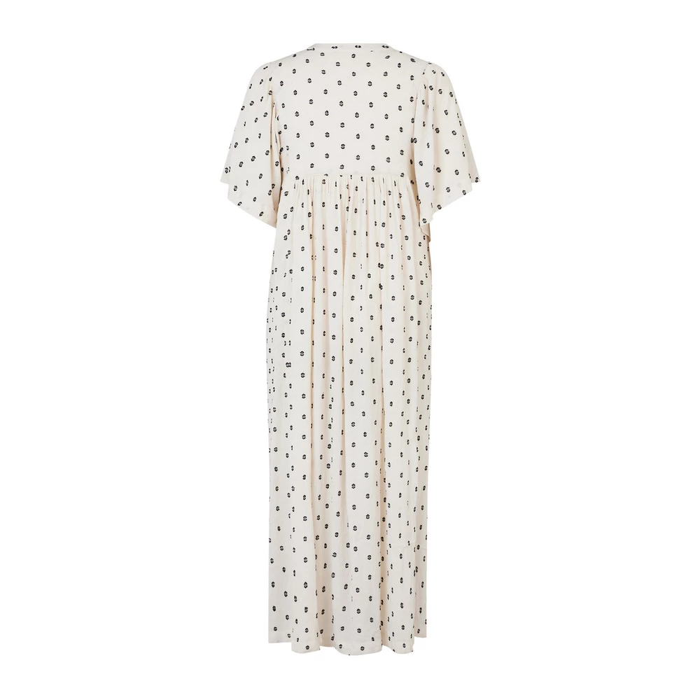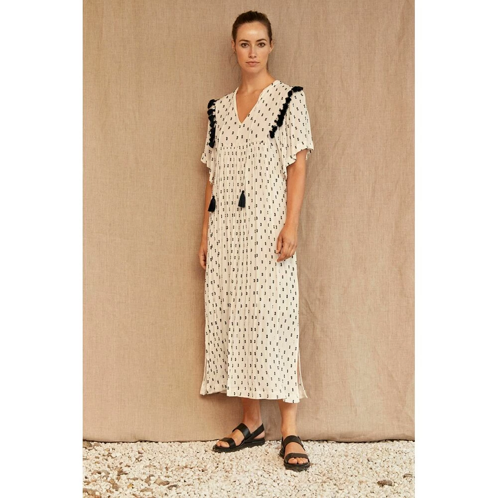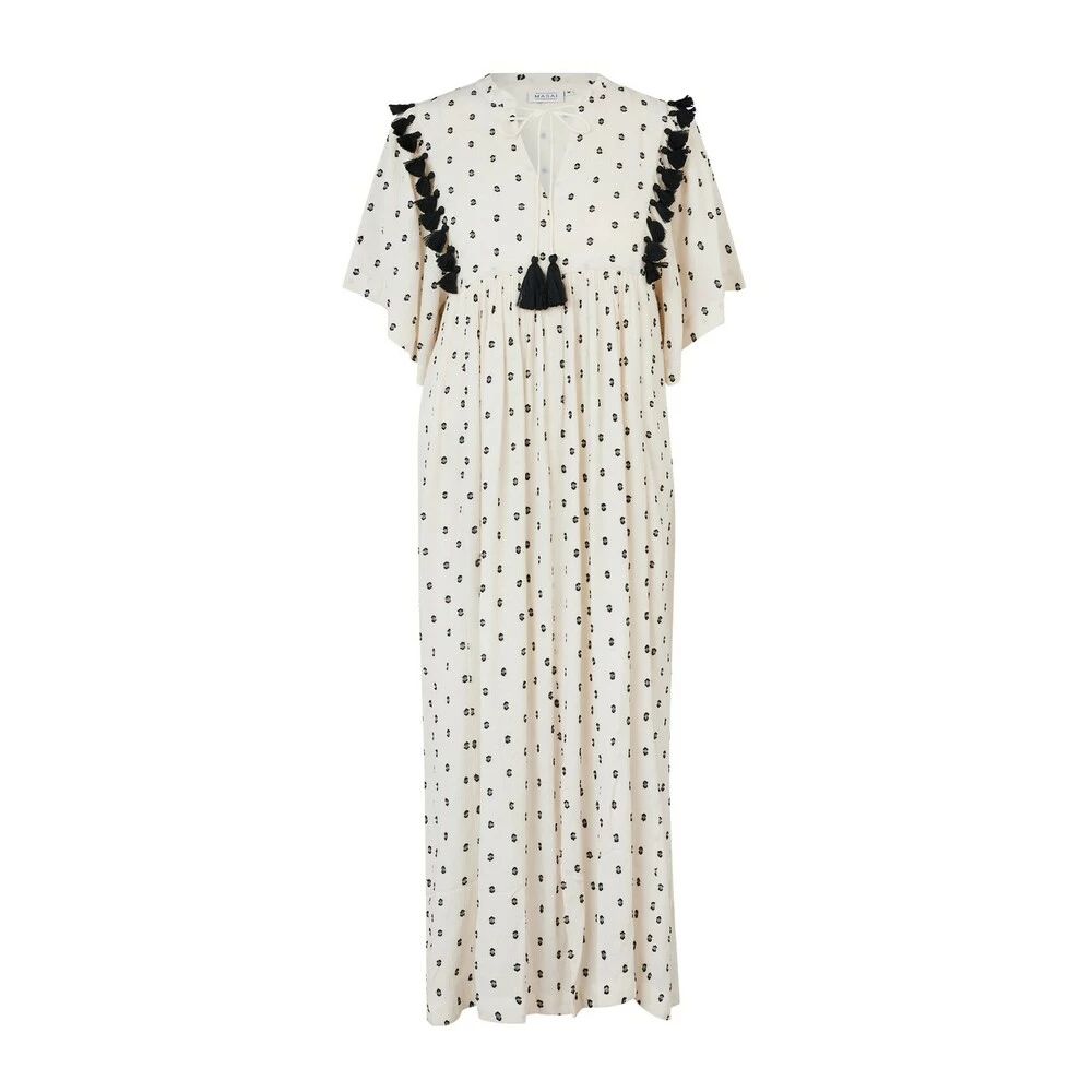 Nillon kjole fra Masai i kremfarget med sorte detaljer. A-fasong, vanlig passform og korte vide ermer. Laget av 98% viskose og 2% polyester.