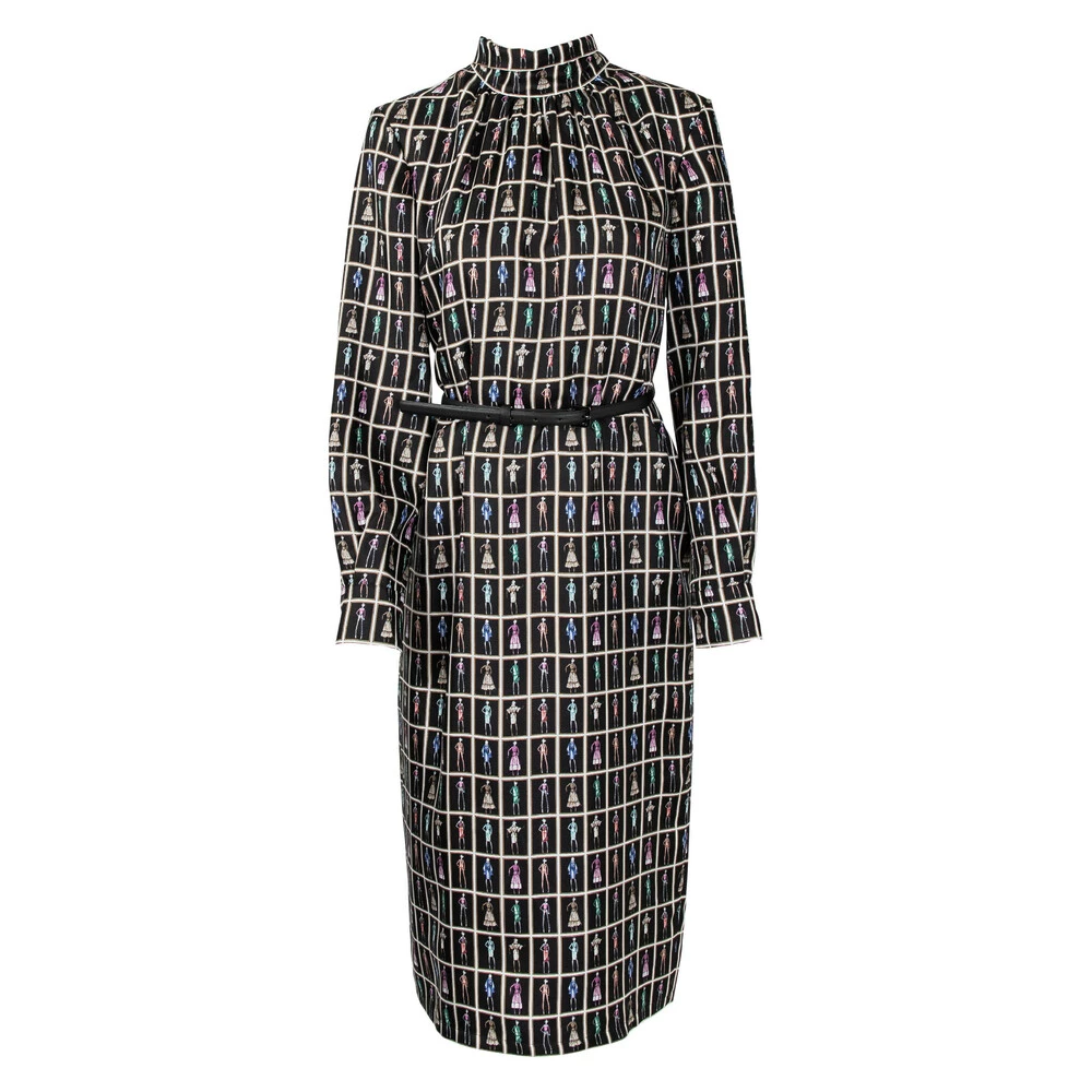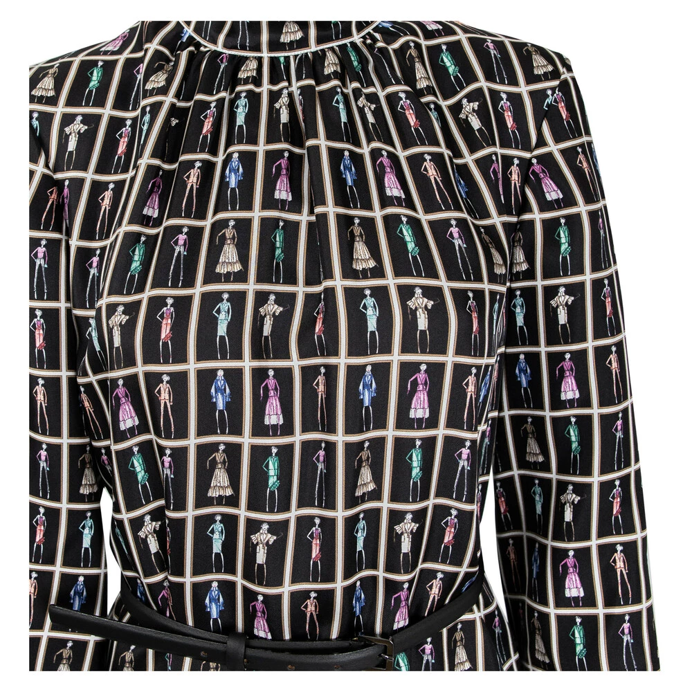Sort kjole med damer i ulike kjoler som motiv. Halterneck med knyting i halsen. Kommer med belte. Materiale: 100% silke. Rens. Spørsmål rettes Z hos Laila AS, 99156475.