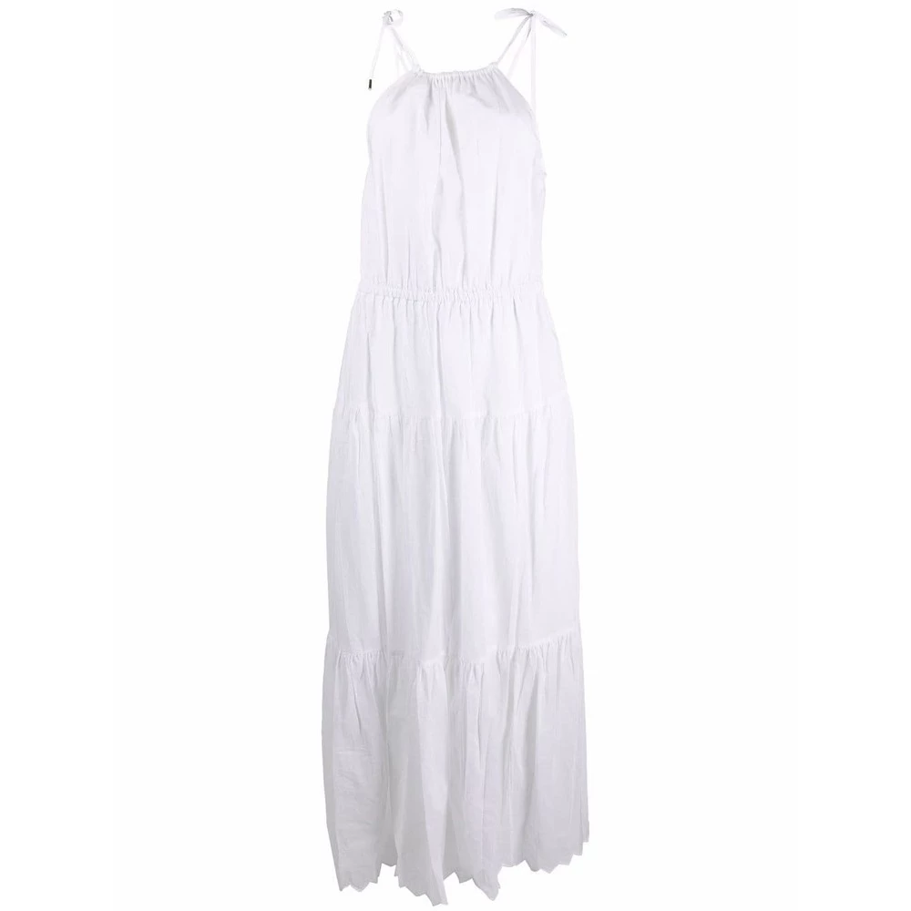 MMK kjoler hvit hvit bomull bomulls lagd kjole fra Michael Kors med fakkel, mannskapshals, sidebinding, lagdelt skjørt og lang lengde.