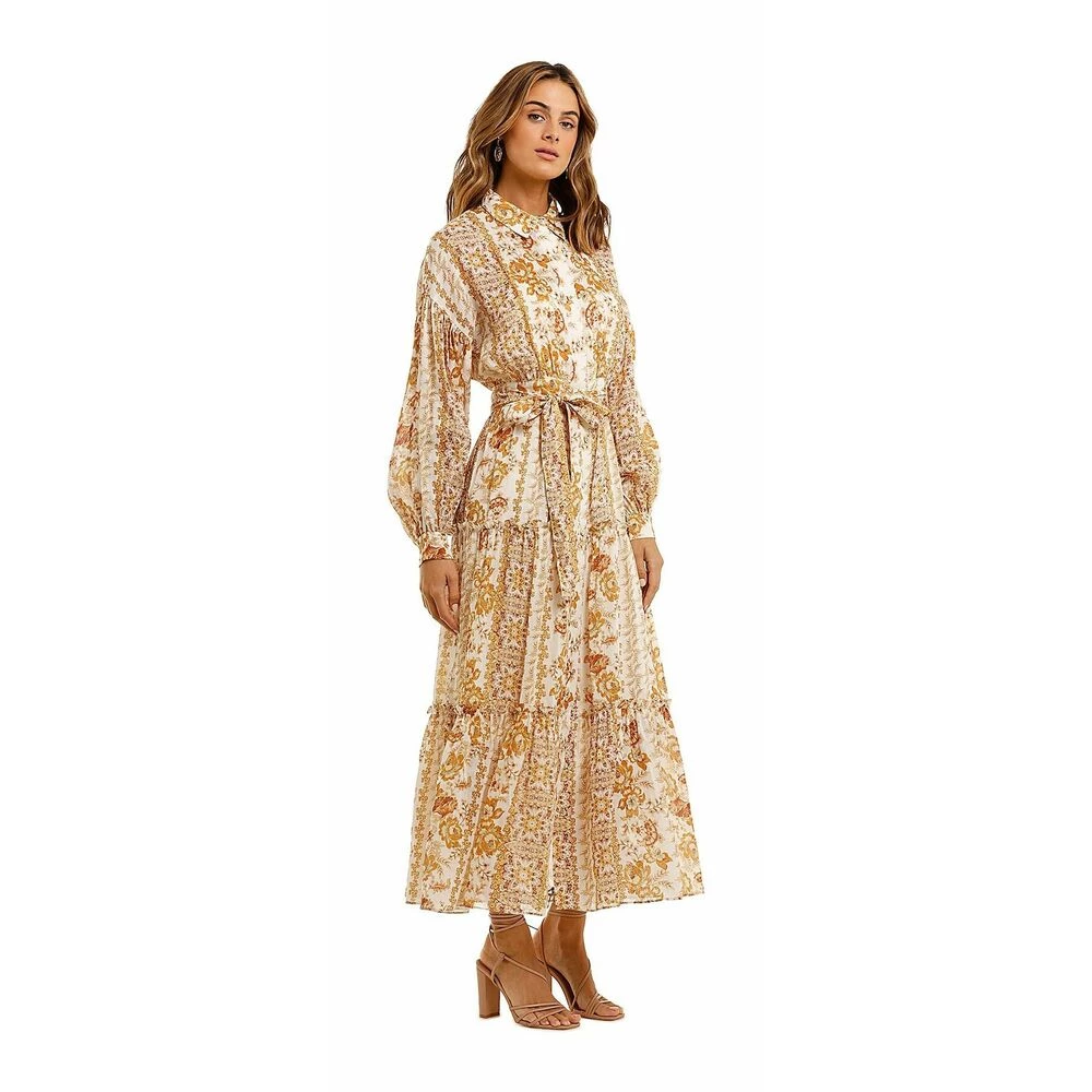 Den er dekorert i et fantastisk barokktrykk i en skjorte-kjole-silhuett, og har lange, bluse-ermer, et midtskjørt splitt og en belte i midjen for å gi dimensjon. Denne kjolen er et must å leie for en kommende lunsj eller hagefest .