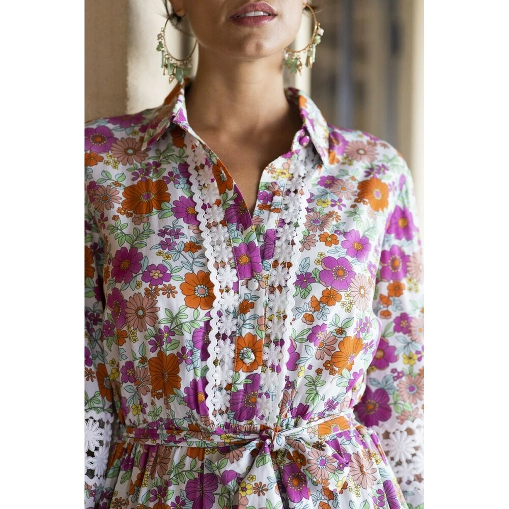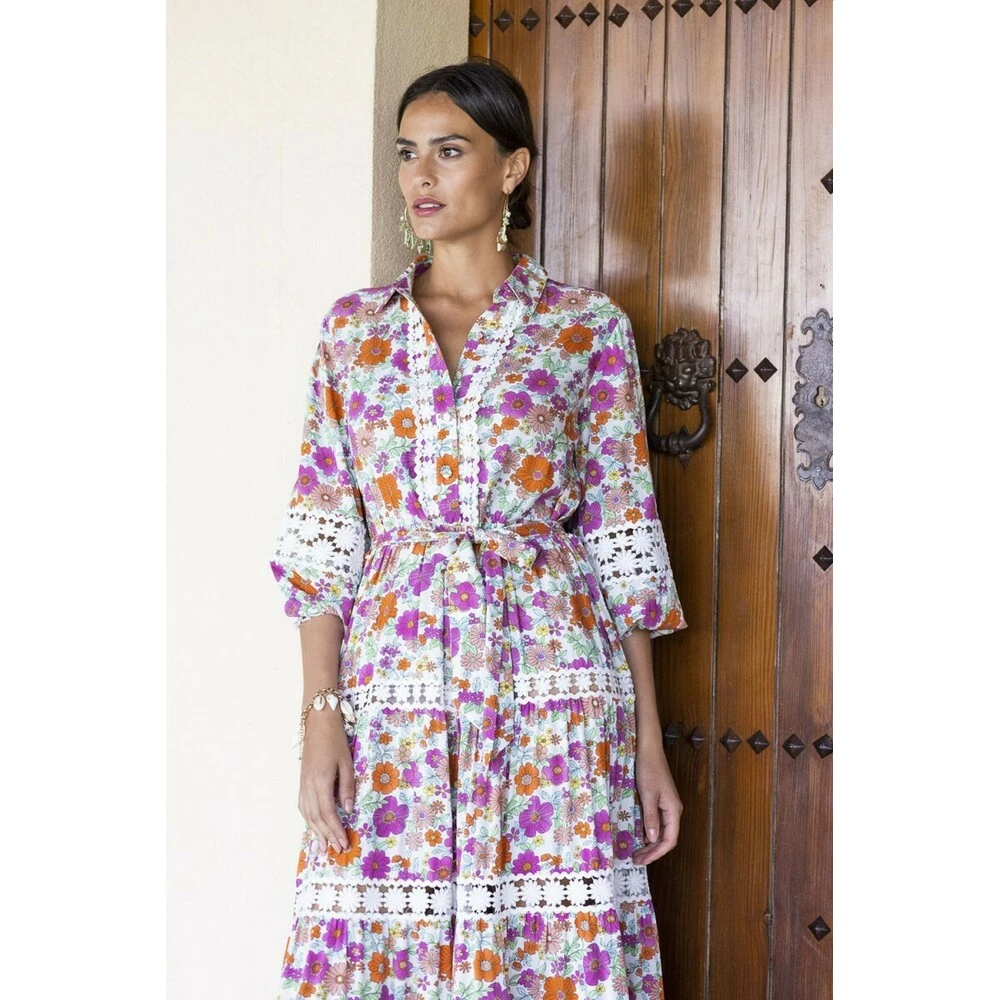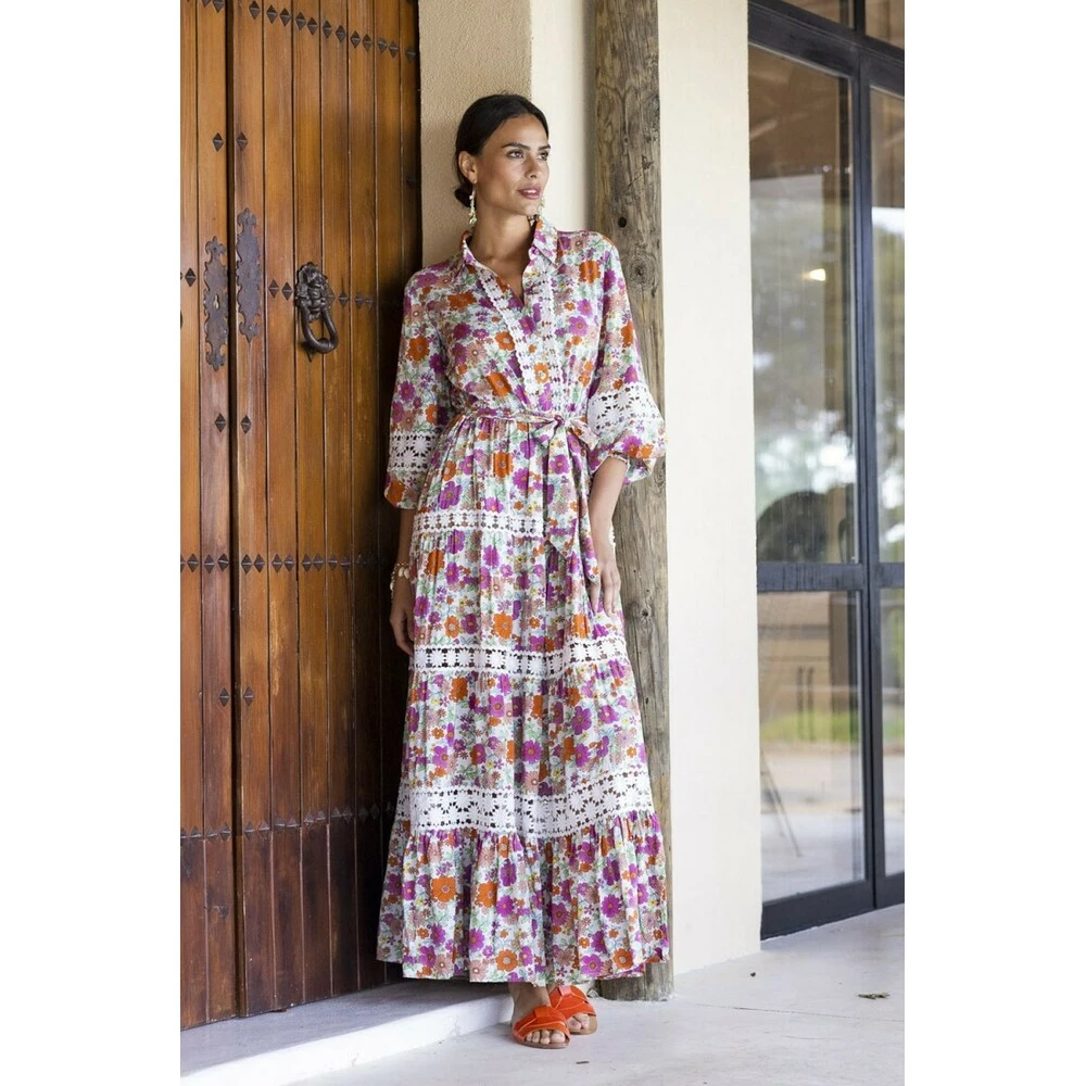 Flott lang kjole i nydelig mønster, fra Miss June. Style den med lekre smykker og en rosa leppestift og du er klar for sommerfest! ONE SIZE Lengde : 150cm // Bryst : 100 cm // Erm : 62cm Kvalitet: 100% Modal Viskose