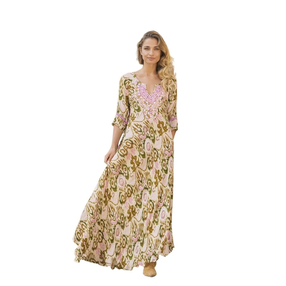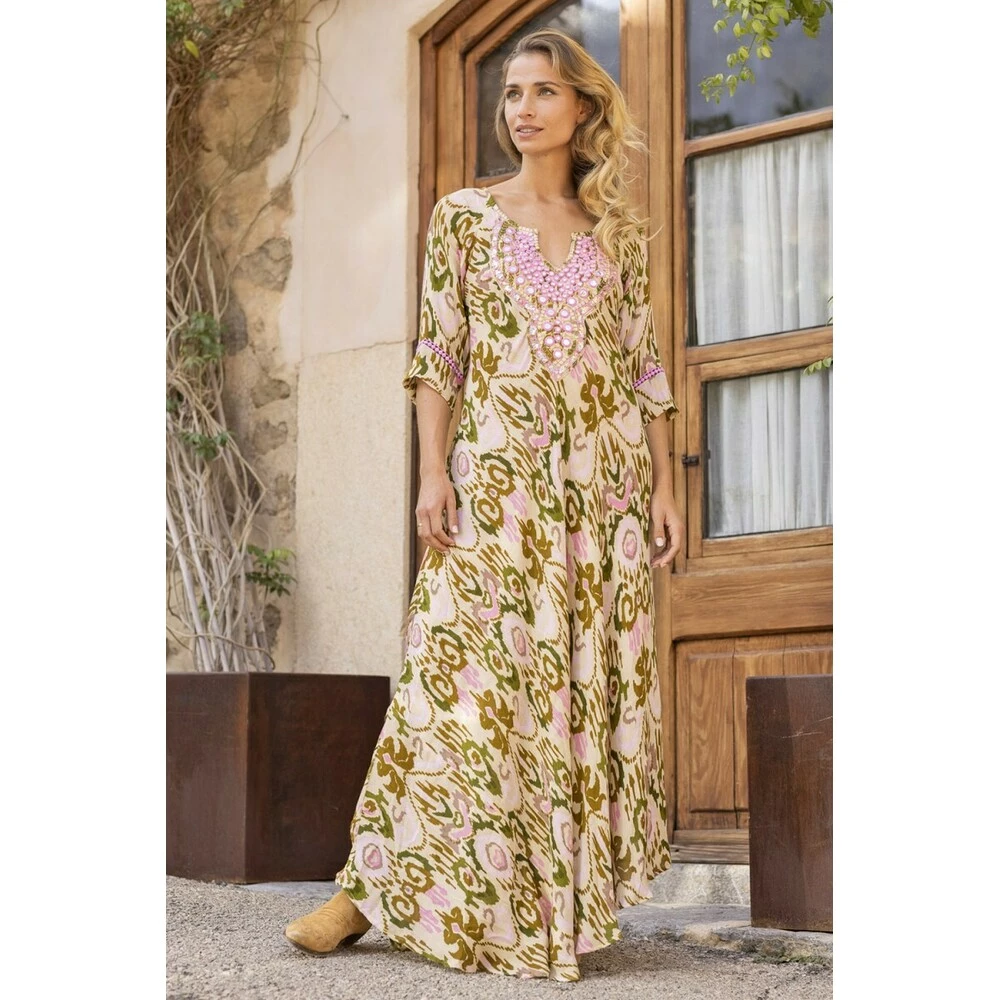 Nydelig maxi kjole fra Miss June. Flatterende v-hals med lekre broderinger med små paljetter, denne lekre kjolen er en sikker vinner i sommer! Style den med sandlaer og en stråkurv. ONE SIZE Lengde : 155 cm // Bryst omkrets : 100 cm // Erm : 50 cm Kvalitet: 100% Crep Rayon Viskose