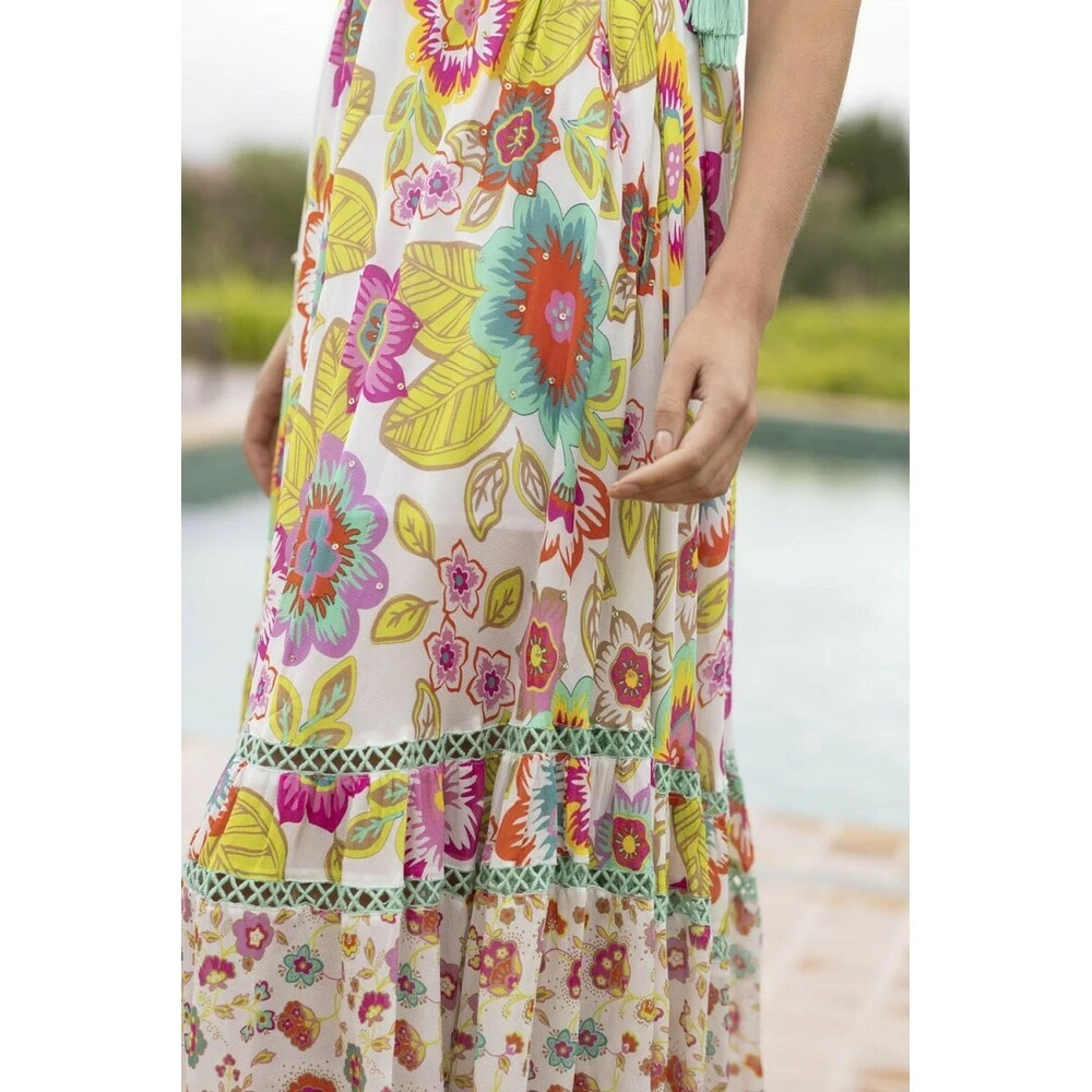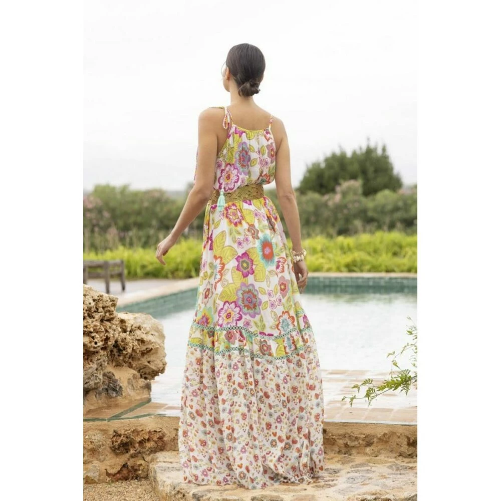 Vakker lang kjole fra Miss June. justerbare stropper og nydelig mønster. Style den med et belte i livet og sandaler ONE SIZE Lengde : 150 cm // Bryst omkrets : 110 Kvalitet: 100% Crep Viskose